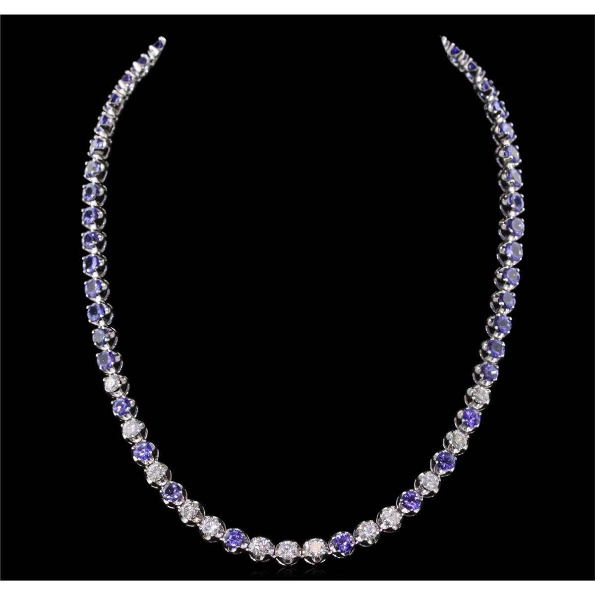 One electronically tested 14KT white gold ladies combination cast & assembled tanzanite and diamond necklace with a bright polish finish. Measurements: 17.25" in length. Identified with markings of "14K". Condition is new. Containing: Fifty prong set round modified brilliant cut natural tanzanites, measuring 5.00 - 5.00 x 2.89 mm, approximate total weight of 24.00ct., clarity is eye clean, type I, medium light, moderately strong, violet color, (GIA V 4/4), cut is good. Thirteen prong set round brilliant cut diamonds, measuring 4.60 - 4.60 x 2.76mm (depth est.) approximate total weight of 13 Stones = 4.63ct. Clarity: SI-1 to I-1. Color: I - J, Cut is Good. Colored gemstones are presumed to have been subjected to commonly used enhancement processes. All diamonds and colored gemstones are graded in the mounting, unless otherwise stated. Total Weight of Colored Stones 24.00ct. Total Weight of Diamonds 4.63ct. Total Weight of Necklace 42.30 grams. GGL Appraised at $32,205.00.