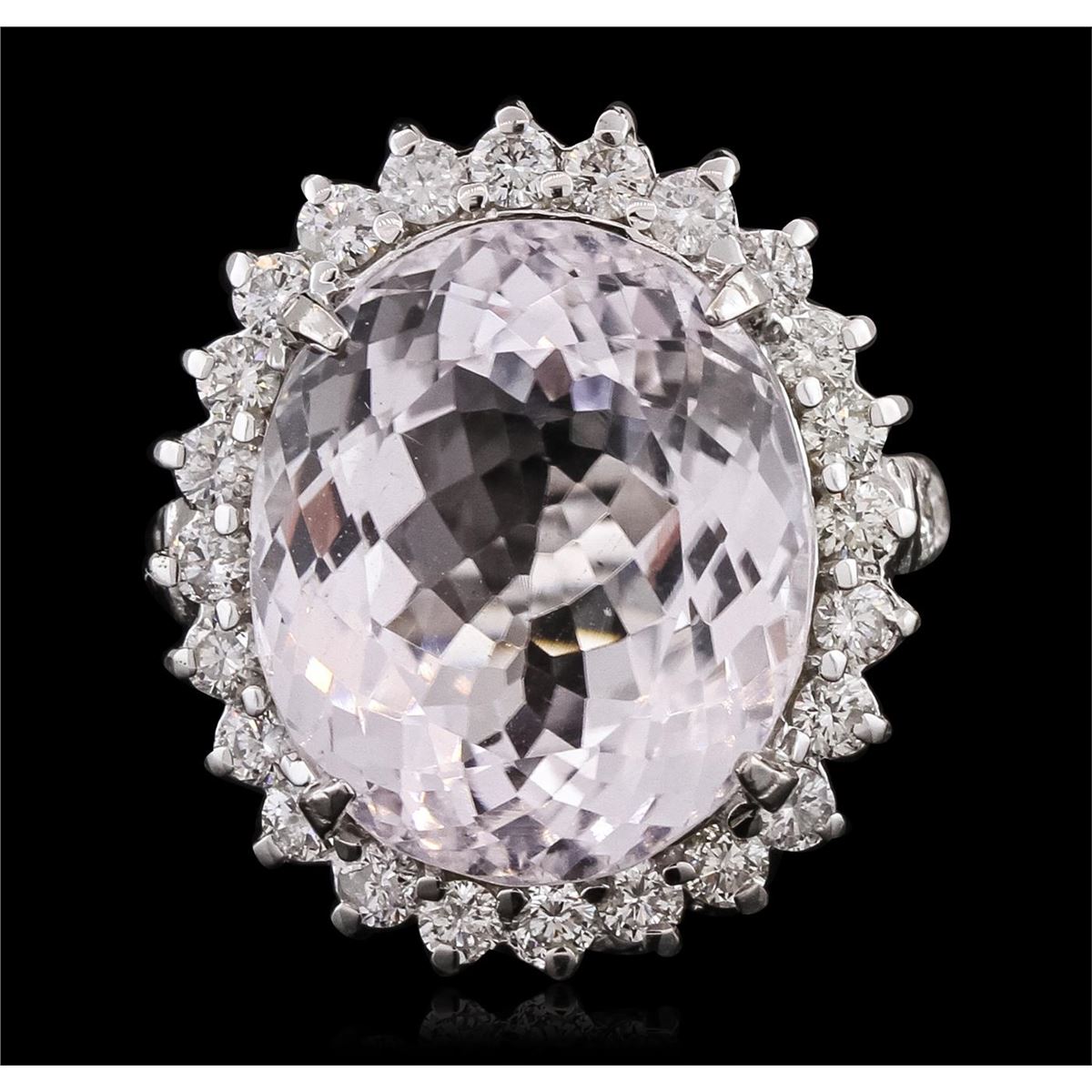 One electronically tested 14KT white gold ladies combination cast & assembled engagement ring with a bright polish finish. Identified with markings of "14K". Condition is new. Containing: One prong set oval modified brilliant cut natural kunzite, measuring 26.80 x 14.00 x 9.10mm, approximate weight of 24.09ct., clarity is eye clean, type I, very light, grayish, purple color, (GIA P 2/1), cut is good. Thirty-Three prong set round brilliant cut diamonds, measuring 2.50 - 2.50 x 1.50mm (depth est.) approximate total weight of 33 Stones = 1.88ct. Clarity: SI-2 to I-1. Color: I - J, Cut is Good. Colored gemstones are presumed to have been subjected to commonly used enhancement processes. All diamonds and colored gemstones are graded in the mounting, unless otherwise stated. Total Weight of Colored Stones 24.09ct. Total Weight of Diamonds 1.88ct. Total Weight of Ring 10.50 grams. GGL Appraised at $8,135.00.