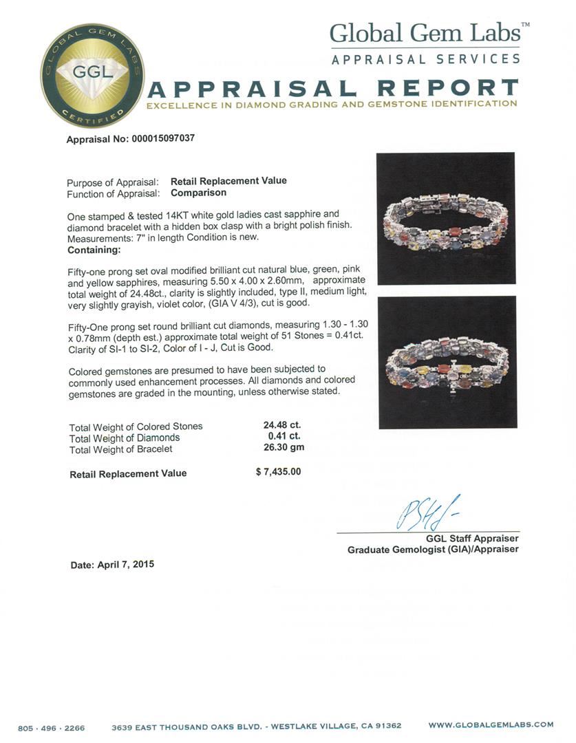 One stamped & tested 14KT white gold ladies cast sapphire and diamond bracelet with a hidden box clasp with a bright polish finish. Measurements: 7" in length Condition is new. Containing: Fifty-one prong set oval modified brilliant cut natural blue, green, pink and yellow sapphires, measuring 5.50 x 4.00. x 2.60mm, approximate total weight of 24.48ct., clarity is slightly included, type II, medium light, very slightly grayish, violet color, (GIA V 4/3), cut is good. Fifty-One prong set round brilliant cut diamonds, measuring 1.30 - 1.30 x 0.78mm (depth est.) approximate total weight of 51 Stones = 0.41ct. Clarity: SI-1 to SI-2. Color: I - J, Cut is Good. Colored gemstones are presumed to have been subjected to commonly used enhancement processes. All diamonds and colored gemstones are graded in the mounting, unless otherwise stated. Total Weight of Colored Stones 24.48ct. Total Weight of Diamonds 0.41ct. Total Weight of Bracelet 26.30 grams. GGL Appraised at $7,435.00.