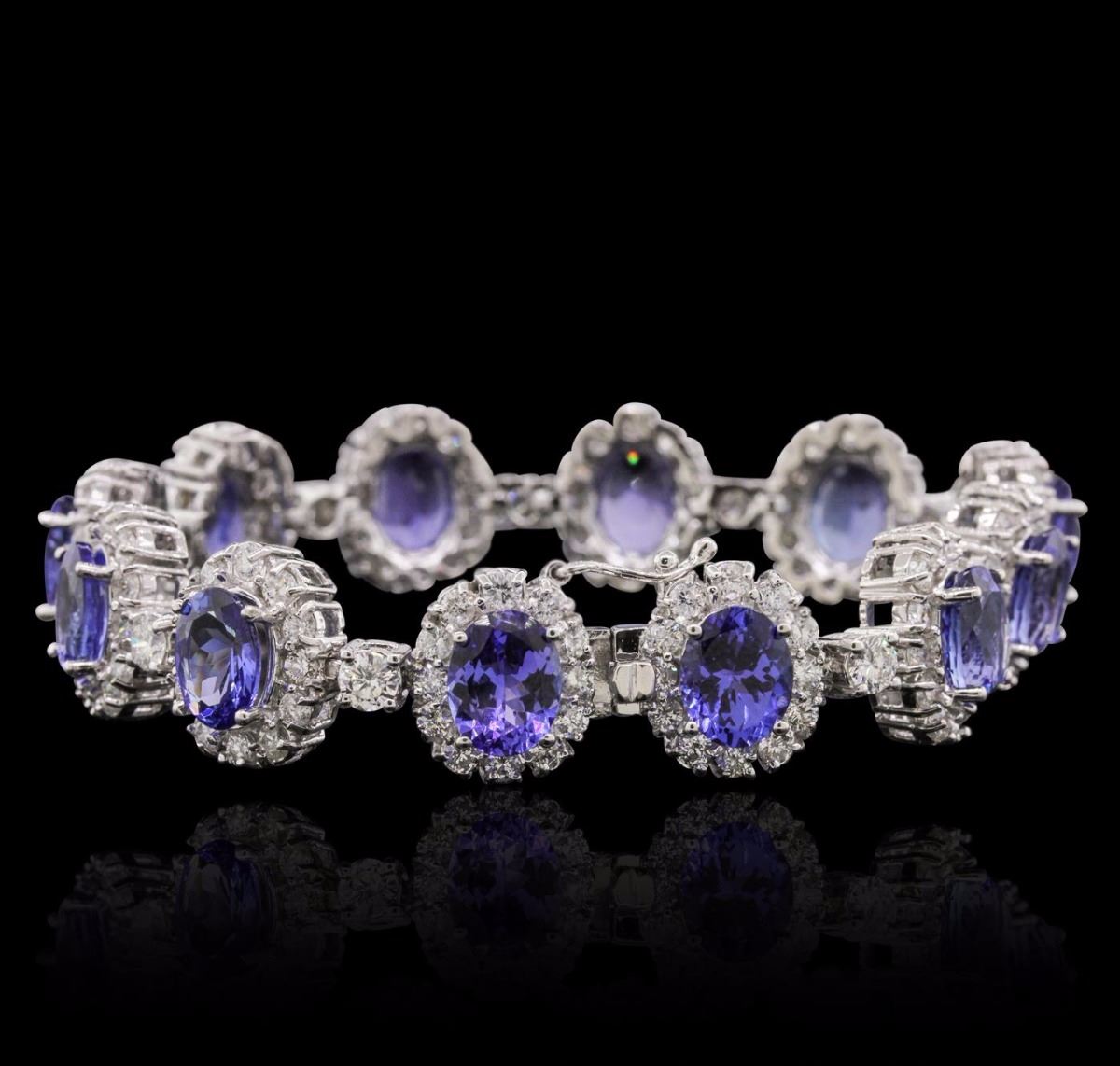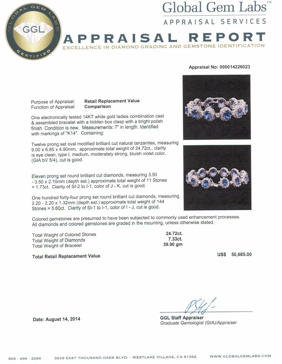 One electronically tested 14KT white gold ladies combination cast & assembled bracelet with a hidden box clasp with a bright polish finish. Condition is new. Measurements: 7" in length. Identified with markings of "K14". Containing: Twelve prong set oval modified brilliant cut natural tanzanites, measuring 9.00 x 6.85 x 4.90mm, approximate total weight of 24.72ct., clarity is eye clean, type I, medium, moderately strong, bluish violet color, (GIA bV 5/4), cut is good. Eleven prong set round brilliant cut diamonds, measuring 3.50 - 3.50 x 2.10mm (depth est.) approximate total weight of 11 Stones = 1.73ct. Clarity: SI-2 to I-1. Color: J - K, Cut is Good. One Hundred Forty-Four prong set round brilliant cut diamonds, measuring 2.20 - 2.20 x 1.32mm (depth est.) approximate total weight of 144 Stones = 5.60ct. Clarity: SI-1 to I-1. Color: I - J, Cut is Good. Colored gemstones are presumed to have been subjected to commonly used enhancement processes. All diamonds and colored gemstones are graded in the mounting, unless otherwise stated. Total Weight of Colored Stones 24.72ct. Total Weight of Diamonds 7.33ct. Total Weight of Bracelet 39.90 grams. GGL Appraised at $50,685.00.