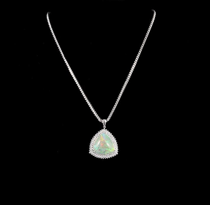 One electronically tested custom cast & assembled opal & diamond pendant with chain. The pendant features an Ethiopian opal is set in an 18KT white gold frame within a tiered diamond gallery. The pendant is supported by a 14KT white gold three millimeter designer style seventeen inch length chain. Condition is new, good workmanship. Containing: One Ethiopian opal that is cut in a triangle shaped cabochon and is prong set, measuring 24.00mm x 24.00mm x 12.00mm, the approximate weight is 25.72 carats. The opal has a quite bright, orange-green play of color (fire) in a rolling flash fire pattern; a high dome; a good cut; slightly included; slight variation in base in its brightness and pattern; and is somewhat directional. Naturally occurring internal & external characteristics are present. Graded in the setting. Eighty-Three prong set round brilliant cut diamonds, measuring 2.30 - 2.00 x 1.33mm (depth est.), 2.00% GTCF approximate total weight of 83 Stones = 3.51ct. Graded in the setting. Clarity VS-2 to SI-2. Color F - H. Total Weight of Opal 25.72 ct. Total Weight of Diamonds 3.51 ct. Total Weight of Pendant with Chain 25.85gm. AIG Appraised at $23,300.00.