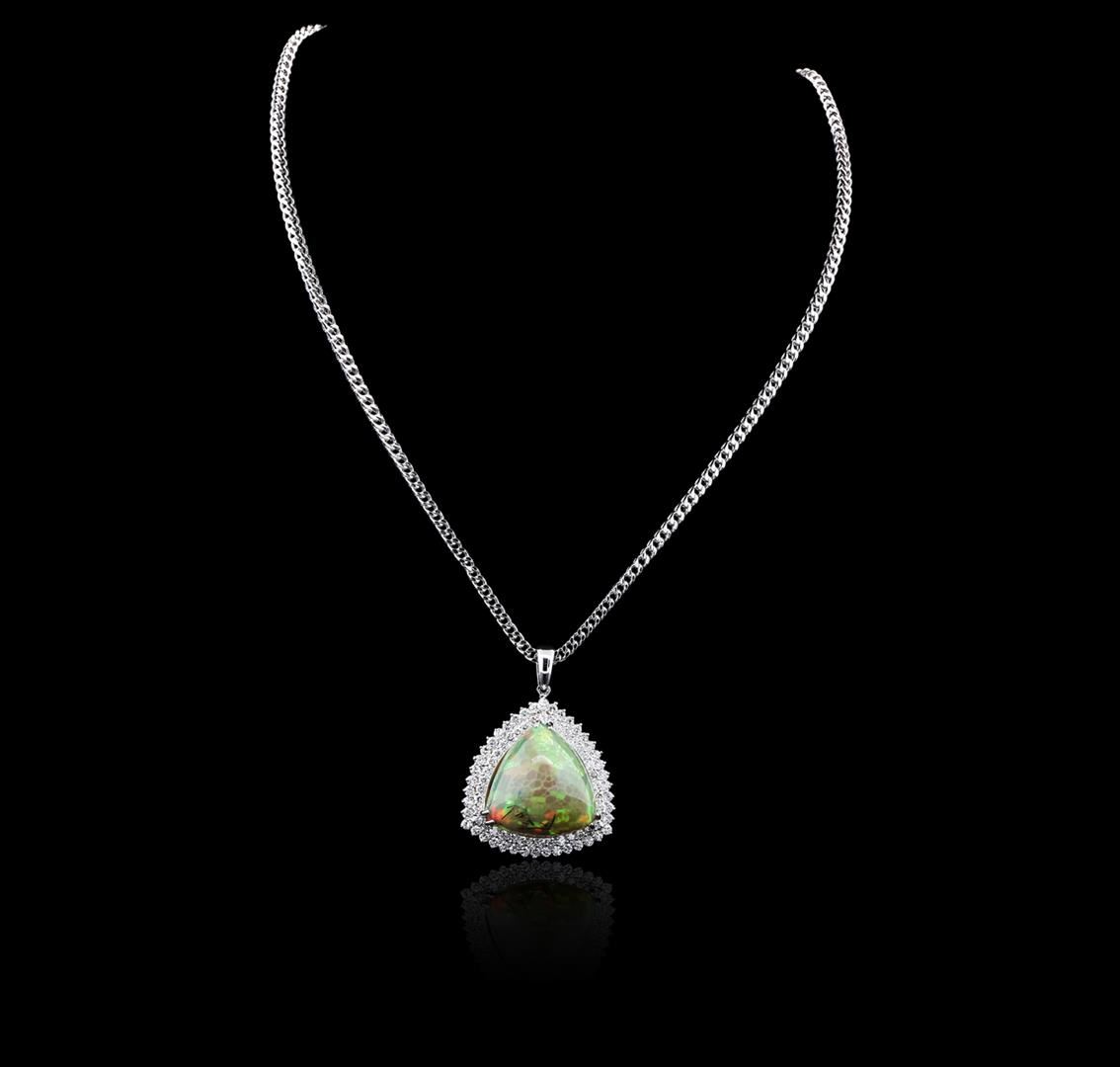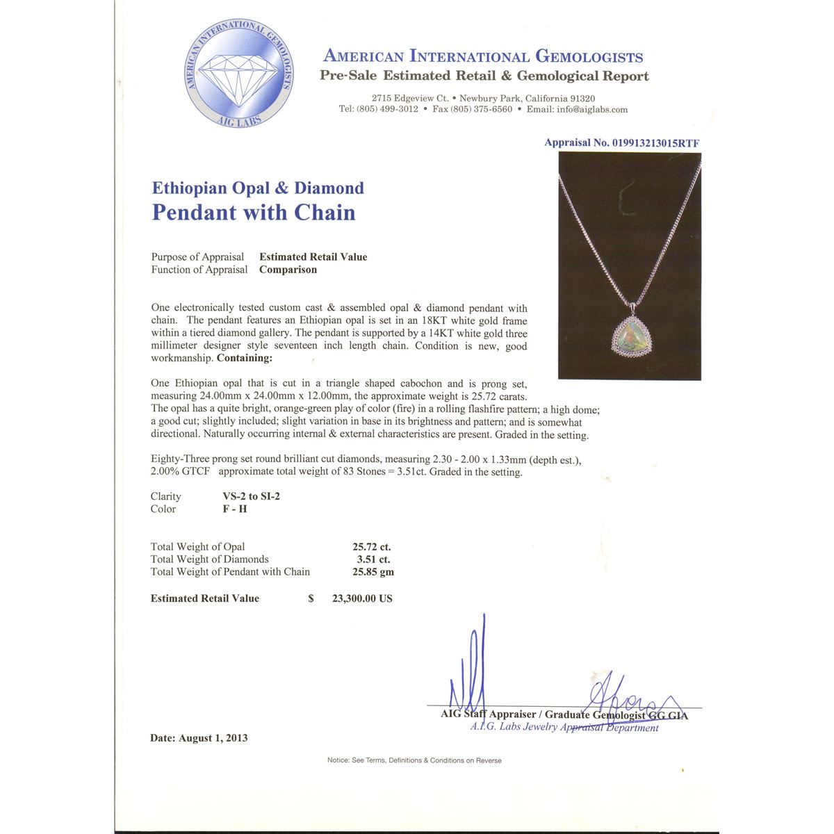 One electronically tested custom cast & assembled opal & diamond pendant with chain. The pendant features an Ethiopian opal is set in an 18KT white gold frame within a tiered diamond gallery. The pendant is supported by a 14KT white gold three millimeter designer style seventeen inch length chain. Condition is new, good workmanship. Containing: One Ethiopian opal that is cut in a triangle shaped cabochon and is prong set, measuring 24.00mm x 24.00mm x 12.00mm, the approximate weight is 25.72 carats. The opal has a quite bright, orange-green play of color (fire) in a rolling flash fire pattern; a high dome; a good cut; slightly included; slight variation in base in its brightness and pattern; and is somewhat directional. Naturally occurring internal & external characteristics are present. Graded in the setting. Eighty-Three prong set round brilliant cut diamonds, measuring 2.30 - 2.00 x 1.33mm (depth est.), 2.00% GTCF approximate total weight of 83 Stones = 3.51ct. Graded in the setting. Clarity VS-2 to SI-2. Color F -- H. Total Weight of Opal 25.72 ct. Total Weight of Diamonds 3.51 ct. Total Weight of Pendant with Chain 25.85gm. AIG Appraised at $23,300.00.