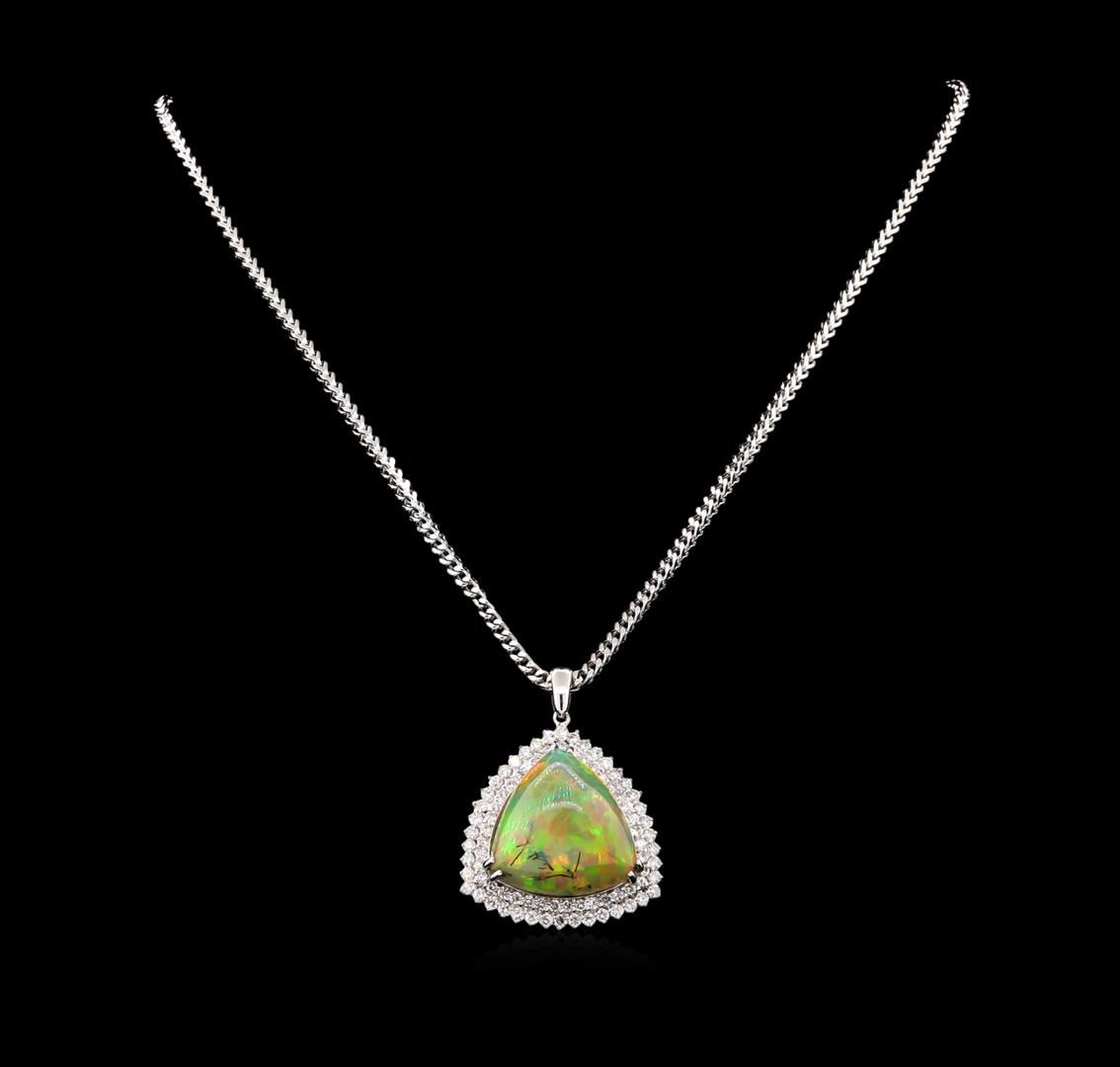 One electronically tested custom cast & assembled opal & diamond pendant with chain. The pendant features an Ethiopian opal is set in an 18KT white gold frame within a tiered diamond gallery. The pendant is supported by a 14KT white gold three millimeter designer style seventeen inch length chain. Condition is new, good workmanship. Containing: One Ethiopian opal that is cut in a triangle shaped cabochon and is prong set, measuring 24.00mm x 24.00mm x 12.00mm, the approximate weight is 25.72 carats. The opal has a quite bright, orange-green play of color (fire) in a rolling flash fire pattern; a high dome; a good cut; slightly included; slight variation in base in its brightness and pattern; and is somewhat directional. Naturally occurring internal & external characteristics are present. Graded in the setting. Eighty-Three prong set round brilliant cut diamonds, measuring 2.30 - 2.00 x 1.33mm (depth est.), 2.00% GTCF approximate total weight of 83 Stones = 3.51ct. Graded in the setting. Clarity VS-2 to SI-2. Color F -- H. Total Weight of Opal 25.72 ct. Total Weight of Diamonds 3.51 ct. Total Weight of Pendant with Chain 25.85gm. AIG Appraised at $23,300.00.
