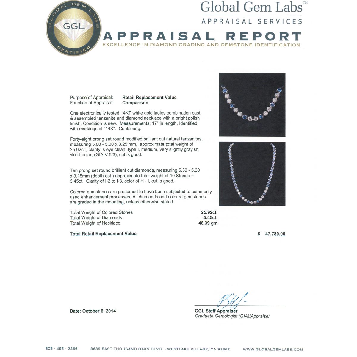 One electronically tested 14KT white gold ladies combination cast & assembled tanzanite and diamond necklace with a bright polish finish. Measurements: 17" in length. Identified with markings of "14K". Condition is new. Containing: Forty-eight prong set round modified brilliant cut natural tanzanites, measuring 5.00 - 5.00 x 3.25 mm, approximate total weight of 25.92ct., clarity is eye clean, type I, medium, very slightly grayish, violet color, (GIA V 5/3), cut is good. Ten prong set round brilliant cut diamonds, measuring 5.30 - 5.30 x 3.18mm (depth est.) approximate total weight of 10 Stones = 5.45ct. Clarity: I-2 to I-3. Color: H - I, Cut is Good. Colored gemstones are presumed to have been subjected to commonly used enhancement processes. All diamonds and colored gemstones are graded in the mounting, unless otherwise stated. Total Weight of Colored Stones 25.92ct. Total Weight of Diamonds 5.45ct. Total Weight of Necklace 46.39 grams. GGL Appraised at $47,780.00.