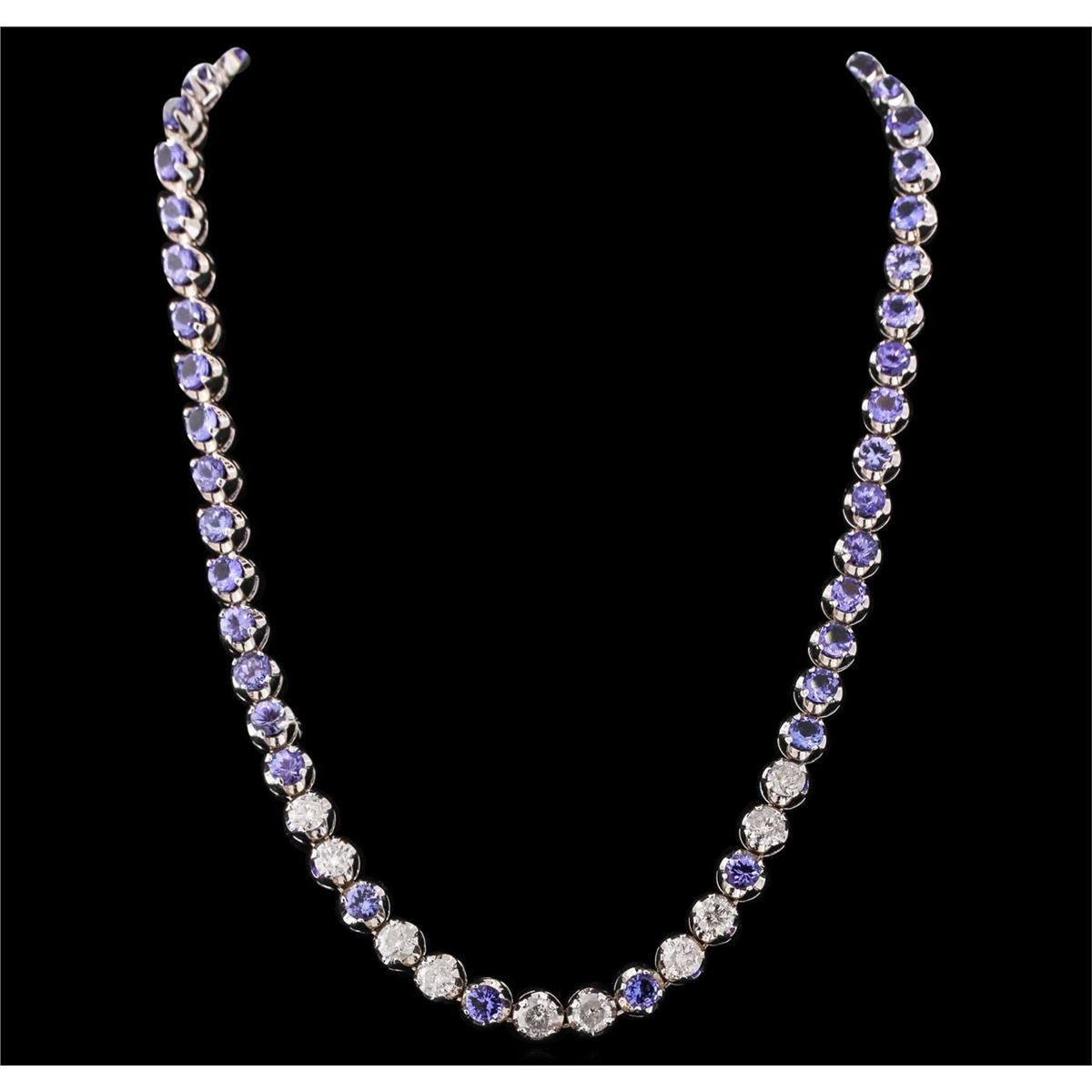 One electronically tested 14KT white gold ladies combination cast & assembled tanzanite and diamond necklace with a bright polish finish. Measurements: 17" in length. Identified with markings of "14K". Condition is new. Containing: Forty-eight prong set round modified brilliant cut natural tanzanites, measuring 5.00 - 5.00 x 3.25 mm, approximate total weight of 25.92ct., clarity is eye clean, type I, medium, very slightly grayish, violet color, (GIA V 5/3), cut is good. Ten prong set round brilliant cut diamonds, measuring 5.30 - 5.30 x 3.18mm (depth est.) approximate total weight of 10 Stones = 5.45ct. Clarity: I-2 to I-3. Color: H - I, Cut is Good. Colored gemstones are presumed to have been subjected to commonly used enhancement processes. All diamonds and colored gemstones are graded in the mounting, unless otherwise stated. Total Weight of Colored Stones 25.92ct. Total Weight of Diamonds 5.45ct. Total Weight of Necklace 46.39 grams. GGL Appraised at $47,780.00.