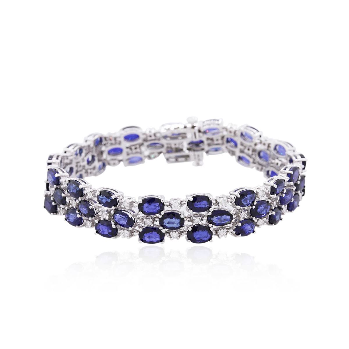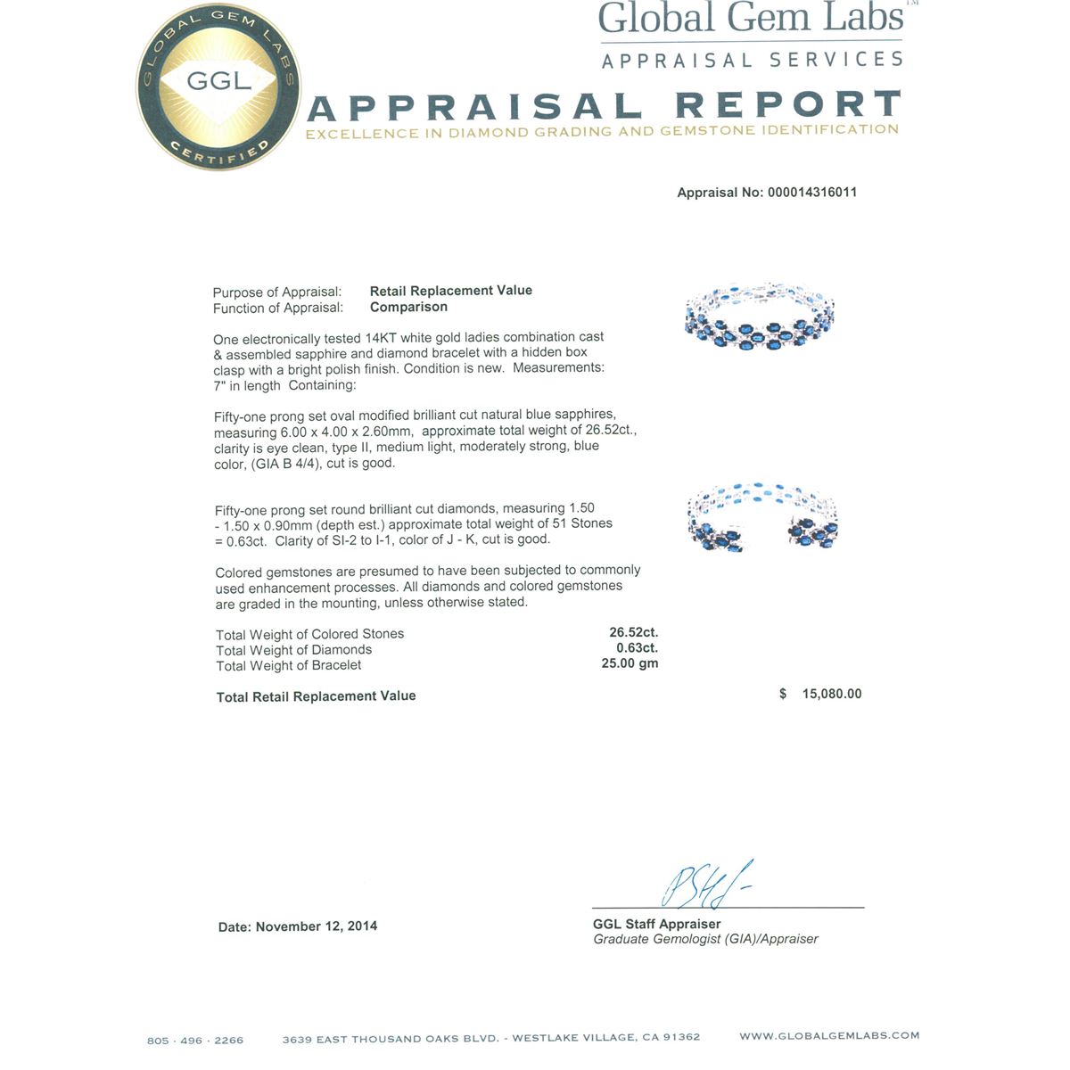 One electronically tested 14KT white gold ladies combination cast & assembled sapphire and diamond bracelet with a hidden box clasp with a bright polish finish. Measurements: 7" in length Condition is new. Containing: Fifty-one prong set oval modified brilliant cut natural blue sapphires, measuring 6.00 x 4.00 x 2.60mm, approximate total weight of 26.52ct., clarity is eye clean, type II, medium light, moderately strong, blue color, (GIA B 4/4), cut is good. Fifty-One prong set round brilliant cut diamonds, measuring 1.50 - 1.50 x 0.90mm (depth est.) approximate total weight of 51 Stones = 0.63ct. Clarity: SI-2 to I-1. Color: J - K, Cut is Good. Colored gemstones are presumed to have been subjected to commonly used enhancement processes. All diamonds and colored gemstones are graded in the mounting, unless otherwise stated. Total Weight of Colored Stones 26.52ct. Total Weight of Diamonds 0.63ct. Total Weight of Bracelet 25.00 grams. GGL Appraised at $15,080.00.