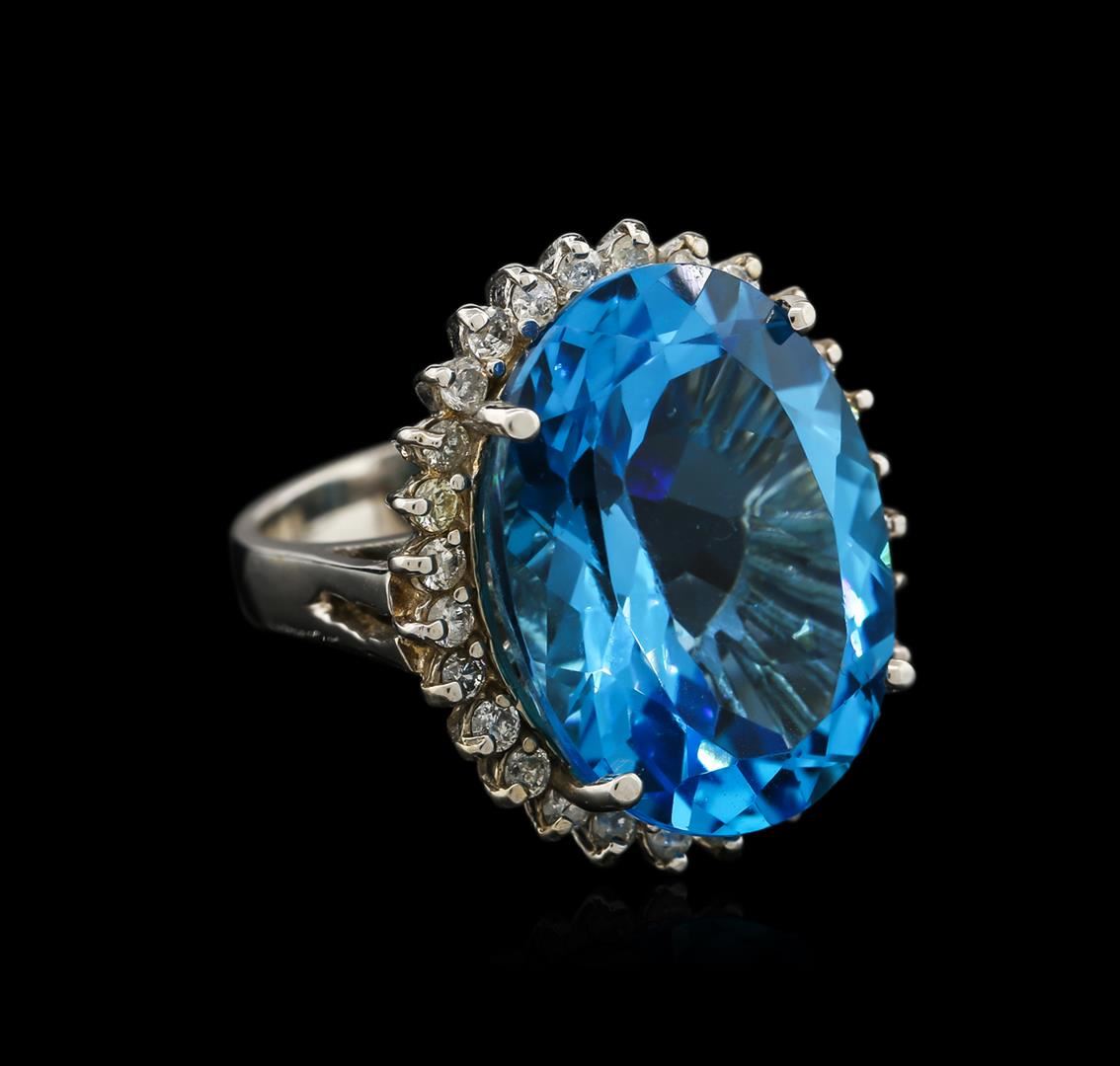 One ring featuring: 14KT white gold weighing 8.80 grams containing one blue topaz center stone with a total weight of 26.80ct and round diamonds with a total weight of 0.92ct.