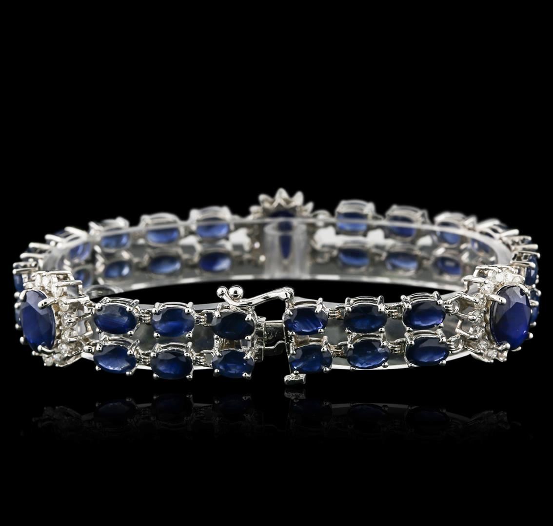 One bracelet featuring: Metal: 14k Solid White Gold. Face Measurements: 14 x 180mm. Size: 7. Finish: Bright Polish. Total Item Weight: 21.0 grams. Markings: Stamped 14K. Country Made: USA. Main Stone: Sapphire. Quantity: 3. Shape: Oval. Color: Blue. Carat Total Weight: 6.50. Measurements: 7 x 9mm. Treatment: Diffusion. Setting: Prong. Hue: Blue. Saturation: Moderately Strong. Tone: Medium Dark. Clarity: Type 2. Cut: Very Good. Secondary Stone: Diamond. Quantity: 42. Shape: Round. Color: White. Carat Total Weight: 1.65. Measurements: 2.2mm. Treatment: None. Setting: Prong. Color Grade: H - I. Clarity: SI1 - SI2. Cut: Very Good. Side Stone: Sapphire. Quantity: 36. Shape: Oval. Color: Blue. Carat Total Weight: 21.00. Measurements: 4 x 6mm. Treatment: Diffusion. Setting: Prong. Hue: Blue. Saturation: Moderately Strong. Tone: Medium Dark. Clarity: Type 2. Cut: Very Good. Excellent Workmanship. Gemstones graded in the mounting. BHGL Appraised at $25,470.00.