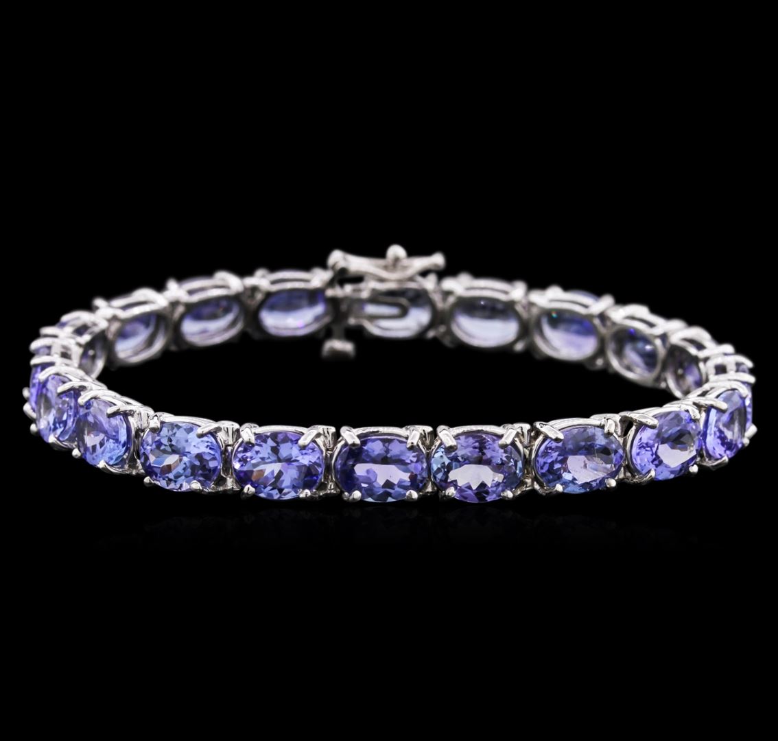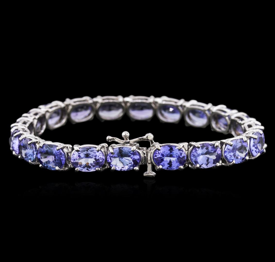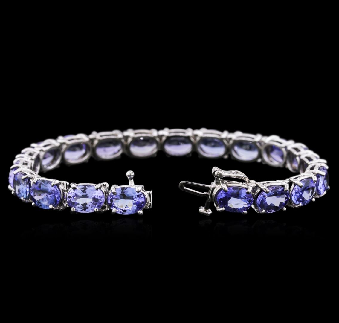 One electronically tested 14KT white gold ladies cast tanzanite bracelet with a hidden box clasp with safety closer with a bright polish finish. 7" in length. Identified with markings of "14K". Condition is new. Containing: Twenty prong set oval modified brilliant cut natural tanzanites, measuring 8.50 x 6.00 x 3.90mm, approximate total weight of 27.82ct., clarity is eye clean, type I, medium light, slightly grayish, violet color, (GIA V 4/2), cut is very good. Colored gemstones are presumed to have been subjected to commonly used enhancement processes. All colored gemstones are graded in the mounting, unless otherwise stated. Total Weight of Colored Stones 27.82ct. Total Weight of Bracelet 19.00 grams. GGL Appraised at $11,810.00.