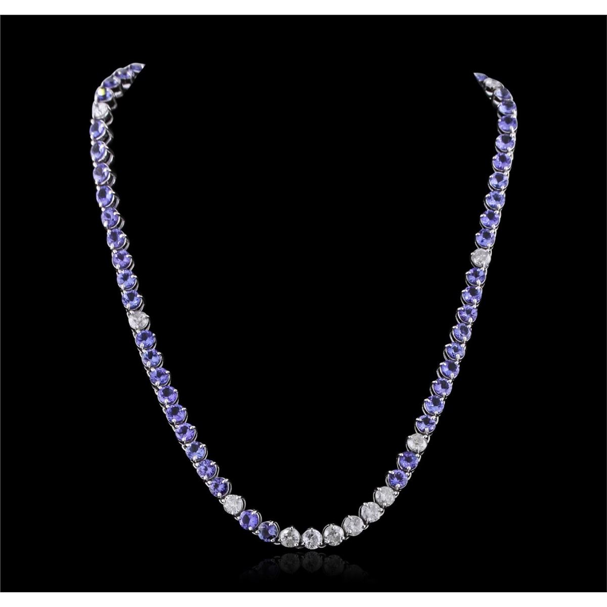 One electronically tested 14KT white gold Ladies combination cast & assembled necklace with a hidden box clasp with a bright polish finish. Condition is new. Measurements: 16.5" in length. Identified with markings of "14K". Containing: Fifty-eight prong set round modified brilliant cut natural tanzanites, measuring 4.80 - 4.80 x 3.12 mm, approximate. Total Weight of 27.84ct., clarity is eye clean, type I, medium light, very slightly grayish, bluish violet color, (GIA bV 4/3), cut is good. Twelve prong set round brilliant cut diamonds, measuring 5.30 - 5.30 x 3.18mm (depth est.) approximate. Total Weight of 12 Stones = 6.54ct. Clarity: I-2 to I-3. Color: I - J, Cut is Good. Colored gemstones are presumed to have been subjected to commonly used enhancement processes. All diamonds and colored gemstones are graded in the mounting, unless otherwise stated. Total Weight of Colored Stones 27.84ct. Total Weight of Diamonds 6.54ct. Total Weight of Necklace 38.20 grams. GGL Appraised at $48,300.00.