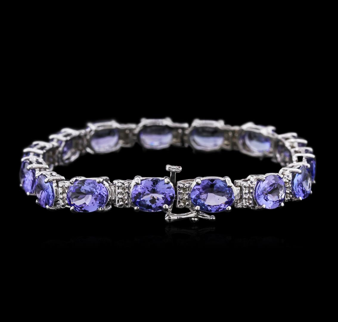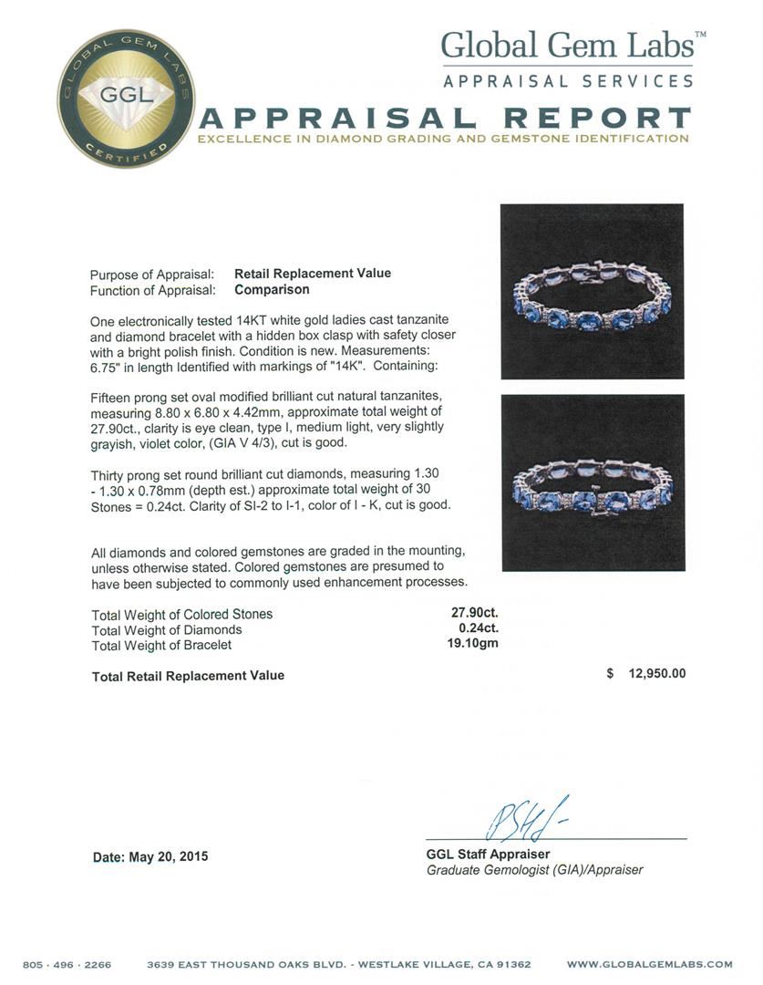 One electronically tested 14KT white gold ladies cast tanzanite and diamond bracelet with a hidden box clasp with safety closer with a bright polish finish. Measurements: 6.75" in length Identified with markings of "14K". Condition is new. Containing: Fifteen prong set oval modified brilliant cut natural tanzanites, measuring 8.80 x 6.80 x 4.42mm, approximate total weight of 27.90ct., clarity is eye clean, type I, medium light, very slightly grayish, violet color, (GIA V 4/3), cut is good. Thirty prong set round brilliant cut diamonds, measuring 1.30 - 1.30 x 0.78mm (depth est.) approximate total weight of 30 Stones = 0.24ct. Clarity: SI-2 to I-1. Color: I - K, Cut is Good. All diamonds and colored gemstones are graded in the mounting, unless otherwise stated. Colored gemstones are presumed to have been subjected to commonly used enhancement processes. Total Weight of Colored Stones 27.90ct. Total Weight of Diamonds 0.24ct. Total Weight of Bracelet 19.10 grams. GGL Appraised at $12,950.00.