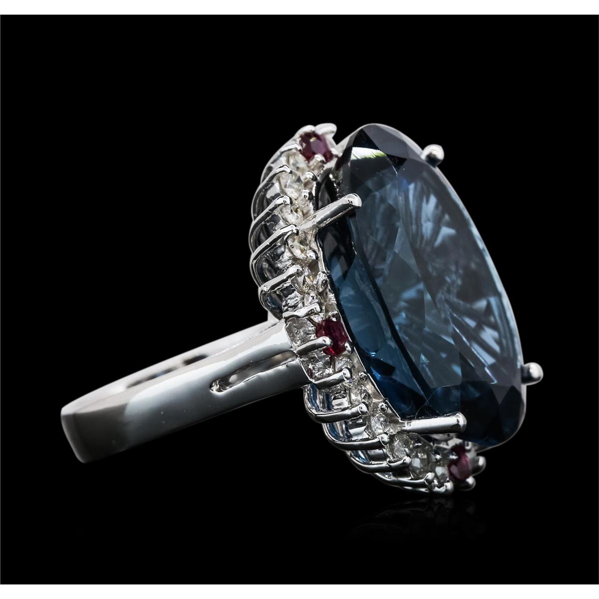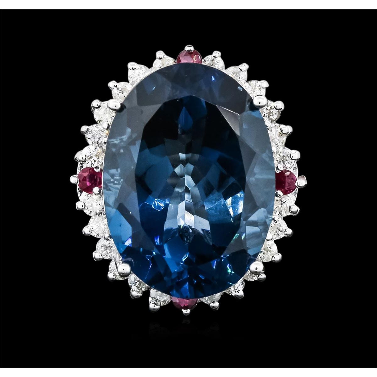 One electronically tested 14KT white gold ladies cast blue topaz, ruby and diamond ring with a bright polish finish. The featured blue topaz is set within a ruby and diamond bezel supported by split shoulders, completed by a three and one-half millimeter wide band. Identified with markings of "K14". Condition is new, good workmanship. Containing: One prong set oval mixed cut natural blue topaz, measuring 21.90 x 15.80 x 10.50mm, 6% bulge factor, approximate weight of 27.92ct., clarity is eye clean, type I, dark, very slightly grayish, very slightly greenish blue color, (GIA vslgB 7/3), cut is good. Transmitting light with no distortion, transparent. Graded in the setting. A deposit of a thin layer has been applied to the topaz to produce the intense color effect. The process utilizes a very high temperature treatment, diffusion of ions into the topaz, plus in some cases neutron bombardment has been used to create the color center. Diffusion processes causes the added ions to become part of the crystal surface with no distinct boundary. Do not put a gem treated in this manner into an ultrasonic cleaner. Four prong set round brilliant cut natural rubies, measuring 2.50 - 2.40 x 1.59 mm, approximate total weight of 0.32ct., clarity is moderately included, type II, medium dark, moderately strong, red color, (GIA R 6/4), cut is good. Transmitting light with a minimum of distortion, transparent. Naturally occurring internal & external characteristics are present. Color grade is an average for the group. Graded in the setting. Twenty-Four prong set round brilliant cut diamonds, measuring 2.10 - 2.00 x 1.23mm (depth est.) approximate total weight of 24 Stones = 0.85ct. Graded in the setting. Clarity: I-1 to I-2. Color: H - J. Total Weight of Colored Stones 28.24ct. Total Weight of Diamonds 0.85ct. Total Weight of Ring 14.71 grams. AIG Appraised at $4,550.00.