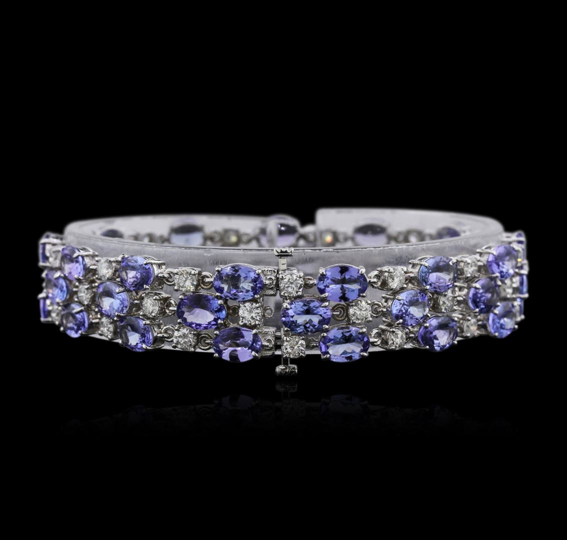 One electronically tested 14KT white gold ladies combination cast & assembled tanzanite and diamond bracelet with a bright polish finish. Bracelet measures 7-1/2" in length and 1/2" width. Condition is new. Containing: Thirty-nine prong set oval modified brilliant cut natural tanzanites, measuring 7.00 x 4.90 x 3.19mm, exact total weight 28.17ct., clarity is eye clean, type I, medium light, slightly grayish, violet color, (GIA V 4/2), cut is good. Thirty-Nine prong set round brilliant cut diamonds, measuring 3.00 - 3.00 x 1.80mm (depth est.) approximate total weight of 39 Stones = 4.40ct. Clarity: SI-1 to SI-2. Color: I - J, Cut is Good. All diamonds and colored gemstones are graded in the mounting, unless otherwise stated. Colored gemstones are presumed to have been subjected to commonly used enhancement processes.. Total Weight of Colored Stones 28.17ct. Total Weight of Diamonds 4.40ct. Total Weight of Bracelet 26.50 grams. GGL Appraised at $18,625.00.