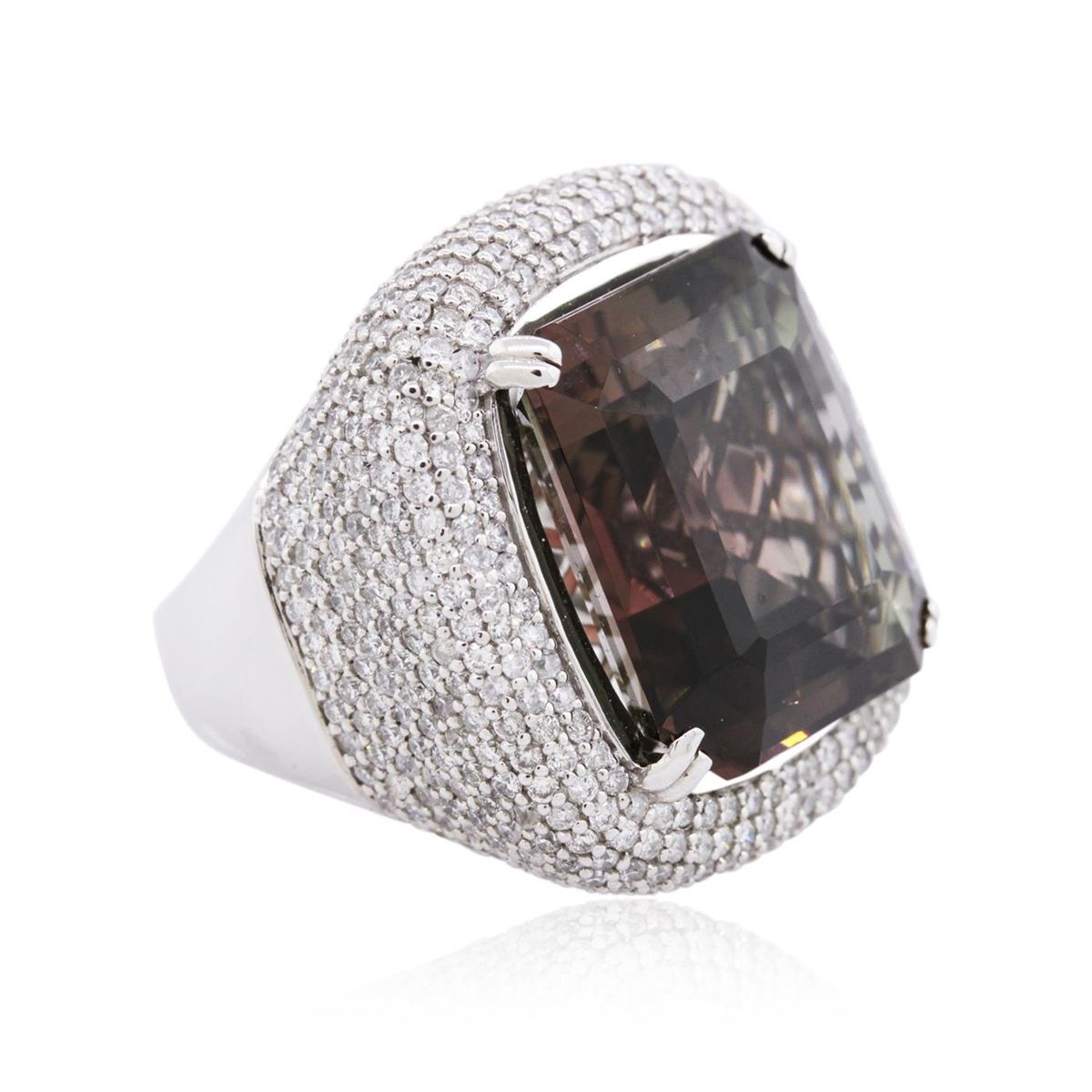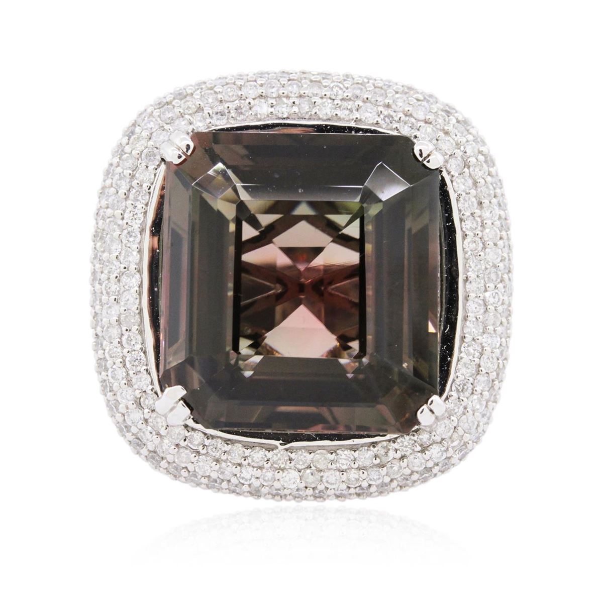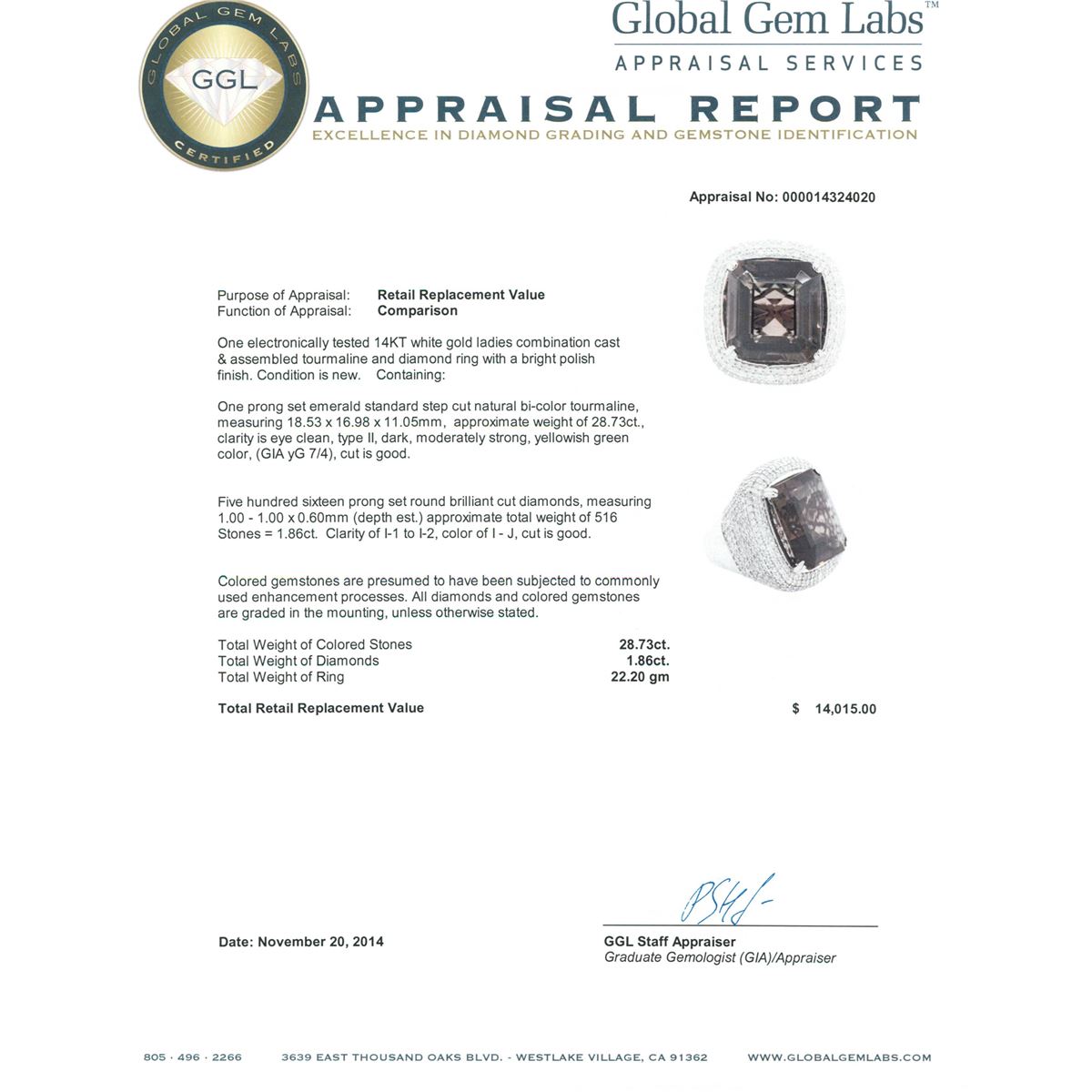 One electronically tested 14KT white gold ladies combination cast & assembled tourmaline and diamond ring with a bright polish finish. Condition is new. Containing: One prong set emerald standard step cut natural bi-color tourmaline, measuring 18.53 x 16.98 x 11.05mm, approximate weight of 28.73ct., clarity is eye clean, type II, dark, moderately strong, yellowish green color, (GIA yG 7/4), cut is good. Five Hundred Sixteen prong set round brilliant cut diamonds, measuring 1.00 - 1.00 x 0.60mm (depth est.) approximate total weight of 516 Stones = 1.86ct. Clarity: I-1 to I-2. Color: I - J, Cut is Good. Colored gemstones are presumed to have been subjected to commonly used enhancement processes. All diamonds and colored gemstones are graded in the mounting, unless otherwise stated. Total Weight of Colored Stones 28.73ct. Total Weight of Diamonds 1.86ct. Total Weight of Ring 22.20 grams. GGL Appraised at $14,015.00.