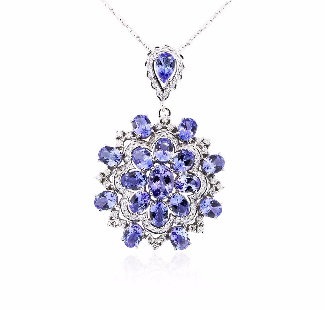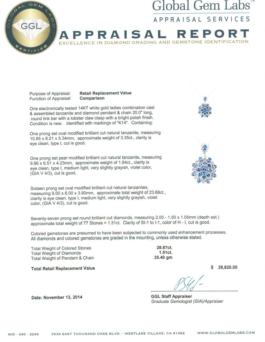 One electronically tested 14KT white gold ladies combination cast & assembled tanzanite and diamond pendant & chain 20.0" long, round link bar with a lobster claw clasp with a bright polish finish. Identified with markings of "K14". Condition is new. Containing: One prong set oval modified brilliant cut natural tanzanite, measuring 10.85 x 8.21 x 5.34mm, approximate weight of 3.35ct., clarity is eye clean, type I, cut is good. One prong set pear modified brilliant cut natural tanzanite, measuring 9.96 x 6.51 x 4.23mm, approximate weight of 1.84ct., clarity is eye clean, type I, medium light, very slightly grayish, violet color, (GIA V 4/3), cut is good. Sixteen prong set oval modified brilliant cut natural tanzanites, measuring 9.00 x 6.00 x 3.90mm, approximate total weight of 23.68ct., clarity is eye clean, type I, medium light, very slightly grayish, violet color, (GIA V 4/3), cut is good. Seventy-Seven prong set round brilliant cut diamonds, measuring 2.00 - 1.50 x 1.05mm (depth est.) approximate total weight of 77 Stones = 1.51ct. Clarity: SI-1 to I-1. Color: H - I, Cut is Good. Colored gemstones are presumed to have been subjected to commonly used enhancement processes. All diamonds and colored gemstones are graded in the mounting, unless otherwise stated. Total Weight of Colored Stones 28.87ct. Total Weight of Diamonds 1.51ct. Total Weight of Pendant & Chain 35.40 grams. GGL Appraised at $28,820.00.
