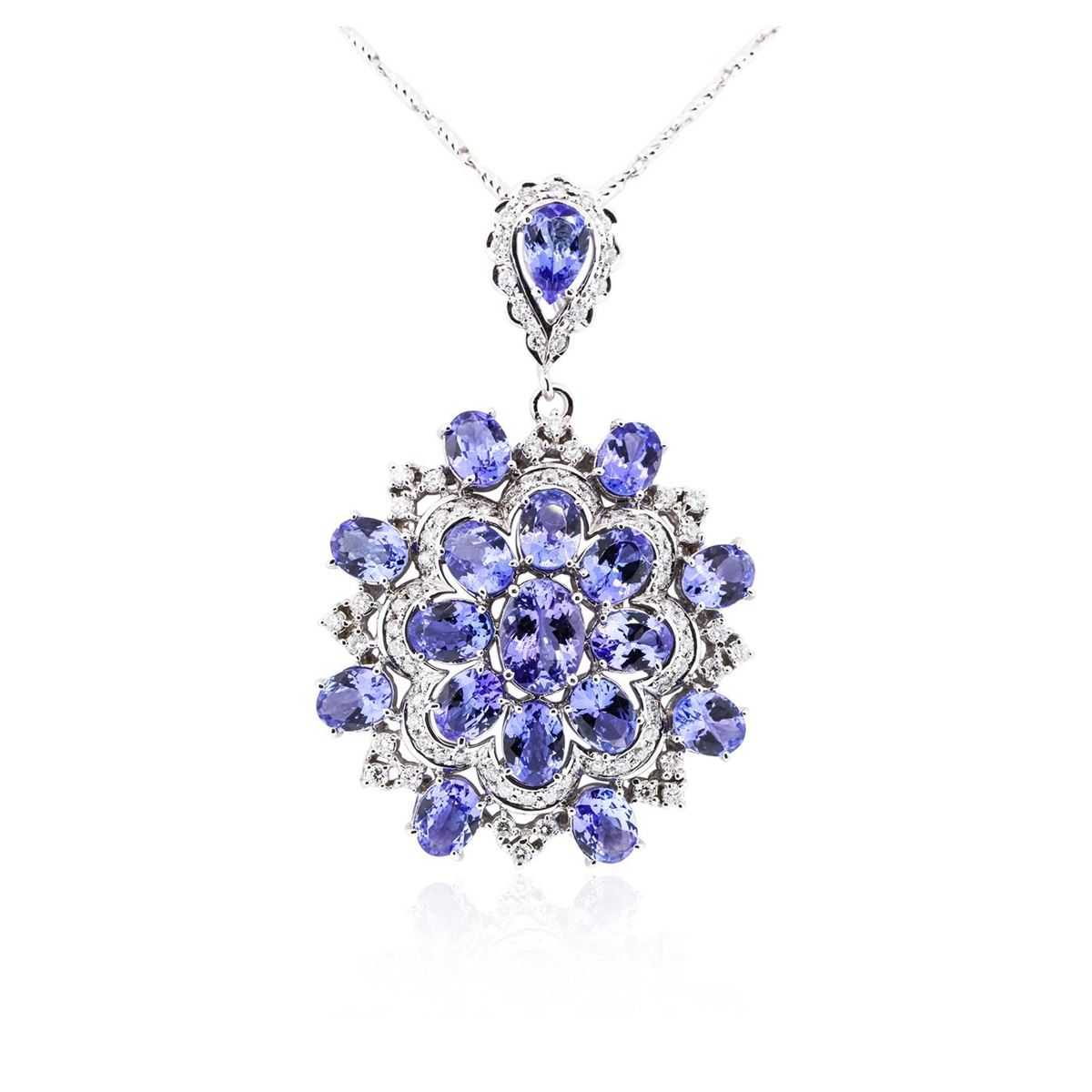 One electronically tested 14KT white gold ladies combination cast & assembled tanzanite and diamond pendant & chain 20.0" long, round link bar with a lobster claw clasp with a bright polish finish. Identified with markings of "K14". Condition is new. Containing: One prong set oval modified brilliant cut natural tanzanite, measuring 10.85 x 8.21 x 5.34mm, approximate weight of 3.35ct., clarity is eye clean, type I, cut is good. One prong set pear modified brilliant cut natural tanzanite, measuring 9.96 x 6.51 x 4.23mm, approximate weight of 1.84ct., clarity is eye clean, type I, medium light, very slightly grayish, violet color, (GIA V 4/3), cut is good. Sixteen prong set oval modified brilliant cut natural tanzanites, measuring 9.00 x 6.00 x 3.90mm, approximate total weight of 23.68ct., clarity is eye clean, type I, medium light, very slightly grayish, violet color, (GIA V 4/3), cut is good. Seventy-Seven prong set round brilliant cut diamonds, measuring 2.00 - 1.50 x 1.05mm (depth est.) approximate total weight of 77 Stones = 1.51ct. Clarity: SI-1 to I-1. Color: H - I, Cut is Good. Colored gemstones are presumed to have been subjected to commonly used enhancement processes. All diamonds and colored gemstones are graded in the mounting, unless otherwise stated. Total Weight of Colored Stones 28.87ct. Total Weight of Diamonds 1.51ct. Total Weight of Pendant & Chain 35.40 grams. GGL Appraised at $28,820.00.