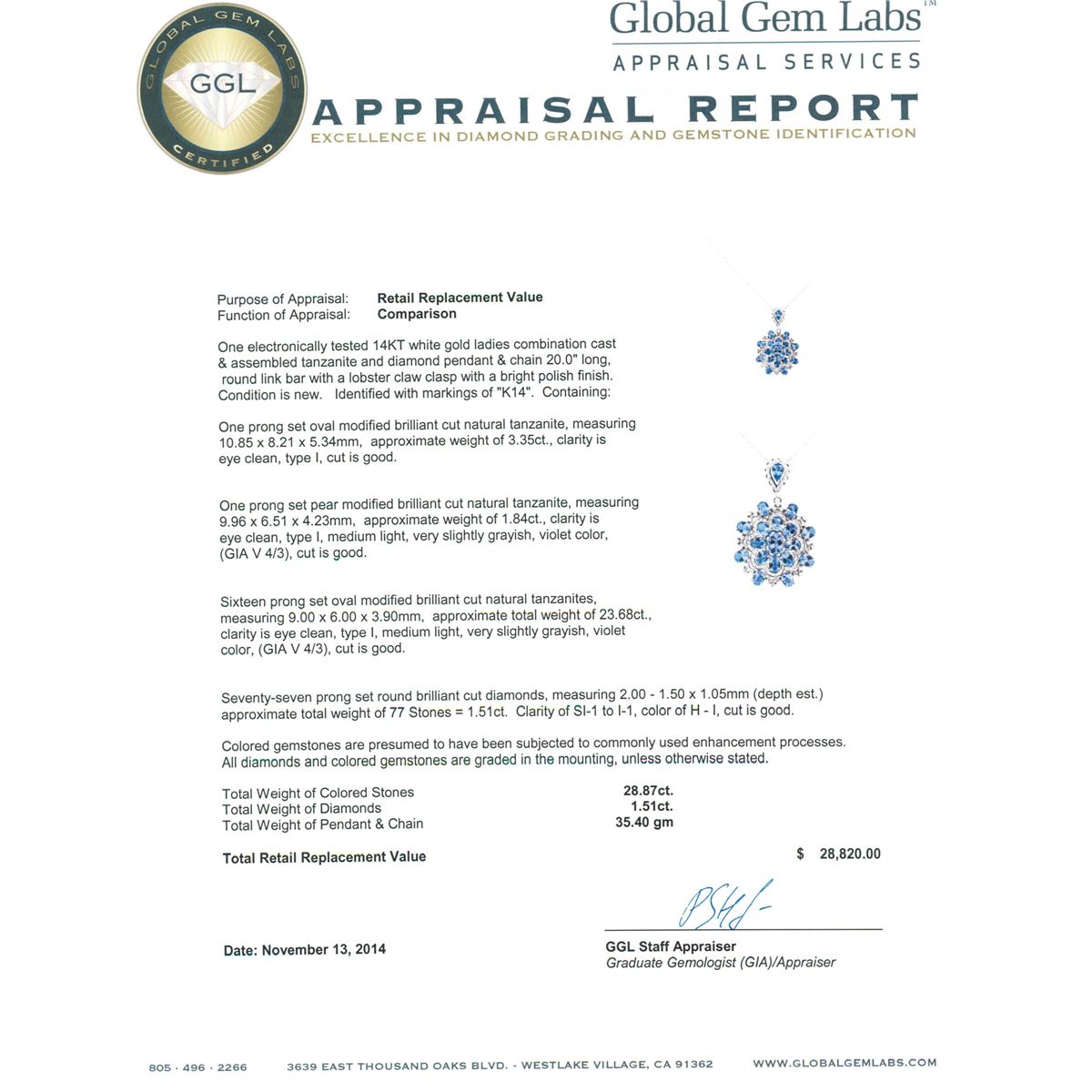 One electronically tested 14KT white gold ladies combination cast & assembled tanzanite and diamond pendant & chain 20.0" long, round link bar with a lobster claw clasp with a bright polish finish. Identified with markings of "K14". Condition is new. Containing: One prong set oval modified brilliant cut natural tanzanite, measuring 10.85 x 8.21 x 5.34mm, approximate weight of 3.35ct., clarity is eye clean, type I, cut is good. One prong set pear modified brilliant cut natural tanzanite, measuring 9.96 x 6.51 x 4.23mm, approximate weight of 1.84ct., clarity is eye clean, type I, medium light, very slightly grayish, violet color, (GIA V 4/3), cut is good. Sixteen prong set oval modified brilliant cut natural tanzanites, measuring 9.00 x 6.00 x 3.90mm, approximate total weight of 23.68ct., clarity is eye clean, type I, medium light, very slightly grayish, violet color, (GIA V 4/3), cut is good. Seventy-Seven prong set round brilliant cut diamonds, measuring 2.00 - 1.50 x 1.05mm (depth est.) approximate total weight of 77 Stones = 1.51ct. Clarity: SI-1 to I-1. Color: H - I, Cut is Good. Colored gemstones are presumed to have been subjected to commonly used enhancement processes. All diamonds and colored gemstones are graded in the mounting, unless otherwise stated. Total Weight of Colored Stones 28.87ct. Total Weight of Diamonds 1.51ct. Total Weight of Pendant & Chain 35.40 grams. GGL Appraised at $28,820.00.