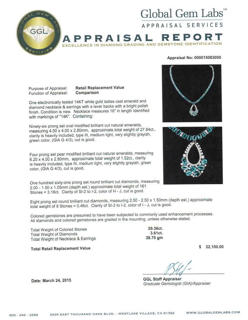 One electronically tested 14KT white gold ladies cast emerald and diamond necklace & earrings with a lever backs with a bright polish finish. Necklace measures 16" in length Identified with markings of "14K". Condition is new. Containing: Ninety-six prong set oval modified brilliant cut natural emeralds, measuring 4.50 x 4.00 x 2.80mm, approximate total weight of 27.84ct., clarity is heavily included, type III, medium light, very slightly grayish, green color, (GIA G 4/3), cut is good. Four prong set pear modified brilliant cut natural emeralds, measuring 6.20 x 4.00 x 2.80mm, approximate total weight of 1.52ct., clarity is heavily included, type III, medium light, very slightly grayish, green color, (GIA G 4/3), cut is good. One Hundred Sixty-One prong set round brilliant cut diamonds, measuring 2.00 - 1.50 x 1.05mm (depth est.) approximate total weight of 161 Stones = 3.16ct. Clarity: SI-2 to I-2. Color: H - J, Cut is Good. Eight prong set round brilliant cut diamonds, measuring 2.50 - 2.50 x 1.50mm (depth est.) approximate total weight of 8 Stones = 0.46ct. Clarity: SI-2 to I-2. Color: I - J, Cut is Good. Colored gemstones are presumed to have been subjected to commonly used enhancement processes. All diamonds and colored gemstones are graded in the mounting, unless otherwise stated. Total Weight of Colored Stones 29.36ct. Total Weight of Diamonds 3.61ct. Total Weight of Necklace & Earrings 38.70 grams. GGL Appraised at $22,100.00.