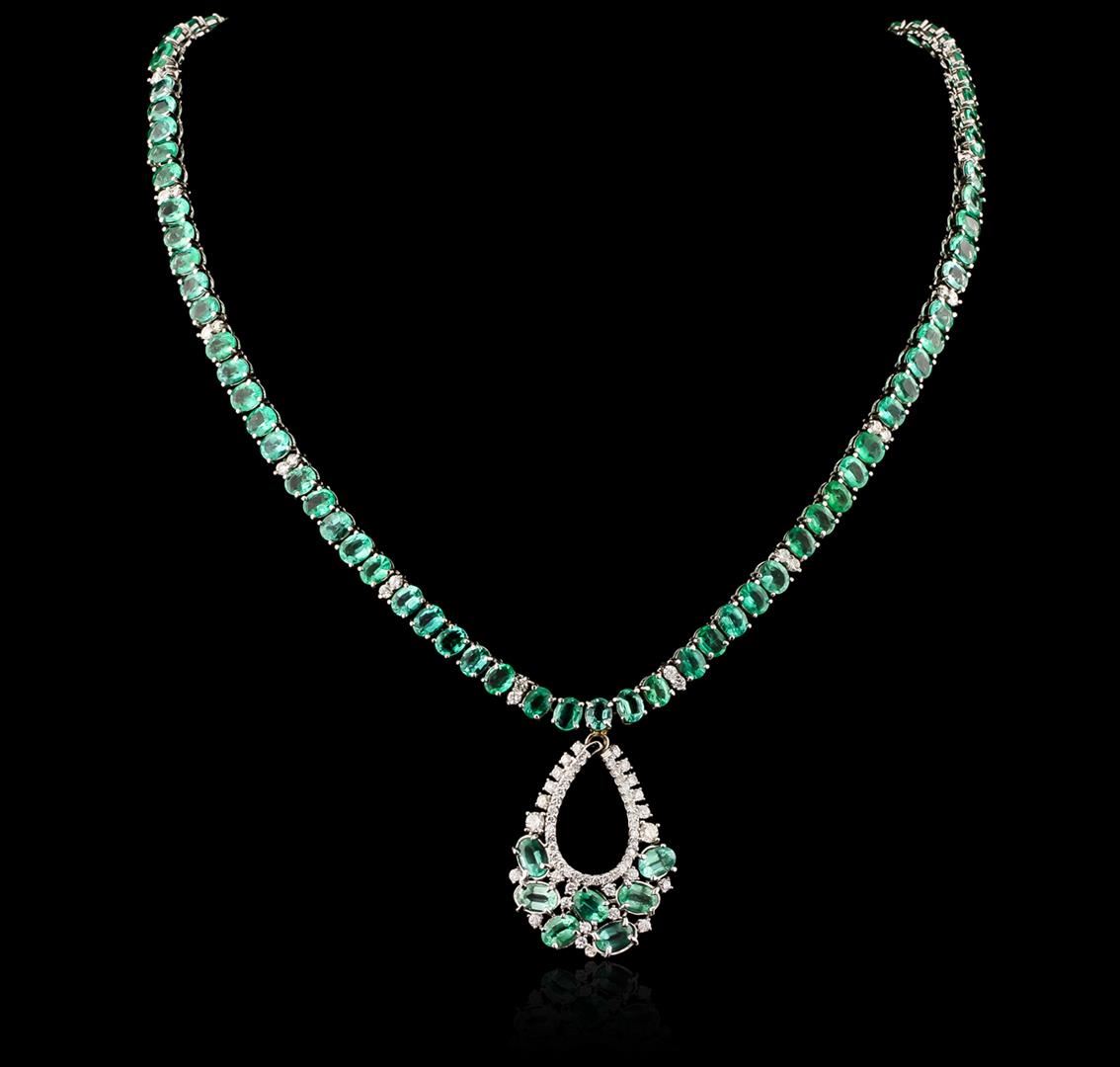 One electronically tested 14KT white gold ladies cast emerald and diamond necklace & earrings with a lever backs with a bright polish finish. Necklace measures 16" in length Identified with markings of "14K". Condition is new. Containing: Ninety-six prong set oval modified brilliant cut natural emeralds, measuring 4.50 x 4.00 x 2.80mm, approximate total weight of 27.84ct., clarity is heavily included, type III, medium light, very slightly grayish, green color, (GIA G 4/3), cut is good. Four prong set pear modified brilliant cut natural emeralds, measuring 6.20 x 4.00 x 2.80mm, approximate total weight of 1.52ct., clarity is heavily included, type III, medium light, very slightly grayish, green color, (GIA G 4/3), cut is good. One Hundred Sixty-One prong set round brilliant cut diamonds, measuring 2.00 - 1.50 x 1.05mm (depth est.) approximate total weight of 161 Stones = 3.16ct. Clarity: SI-2 to I-2. Color: H - J, Cut is Good. Eight prong set round brilliant cut diamonds, measuring 2.50 - 2.50 x 1.50mm (depth est.) approximate total weight of 8 Stones = 0.46ct. Clarity: SI-2 to I-2. Color: I - J, Cut is Good. Colored gemstones are presumed to have been subjected to commonly used enhancement processes. All diamonds and colored gemstones are graded in the mounting, unless otherwise stated. Total Weight of Colored Stones 29.36ct. Total Weight of Diamonds 3.61ct. Total Weight of Necklace & Earrings 38.70 grams. GGL Appraised at $22,100.00.