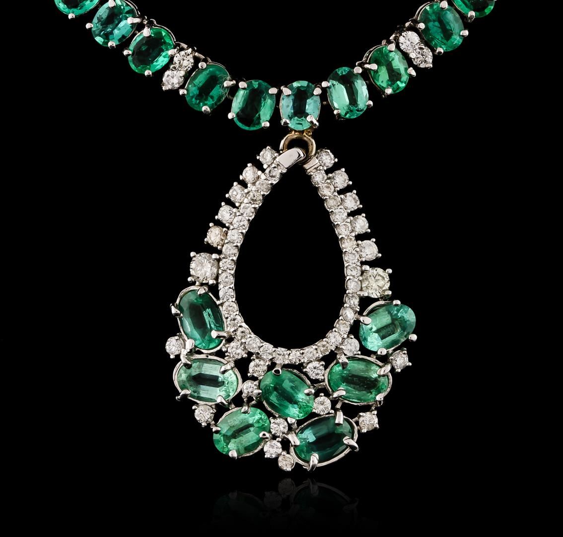 One electronically tested 14KT white gold ladies cast emerald and diamond necklace & earrings with a lever backs with a bright polish finish. Necklace measures 16" in length Identified with markings of "14K". Condition is new. Containing: Ninety-six prong set oval modified brilliant cut natural emeralds, measuring 4.50 x 4.00 x 2.80mm, approximate total weight of 27.84ct., clarity is heavily included, type III, medium light, very slightly grayish, green color, (GIA G 4/3), cut is good. Four prong set pear modified brilliant cut natural emeralds, measuring 6.20 x 4.00 x 2.80mm, approximate total weight of 1.52ct., clarity is heavily included, type III, medium light, very slightly grayish, green color, (GIA G 4/3), cut is good. One Hundred Sixty-One prong set round brilliant cut diamonds, measuring 2.00 - 1.50 x 1.05mm (depth est.) approximate total weight of 161 Stones = 3.16ct. Clarity: SI-2 to I-2. Color: H - J, Cut is Good. Eight prong set round brilliant cut diamonds, measuring 2.50 - 2.50 x 1.50mm (depth est.) approximate total weight of 8 Stones = 0.46ct. Clarity: SI-2 to I-2. Color: I - J, Cut is Good. Colored gemstones are presumed to have been subjected to commonly used enhancement processes. All diamonds and colored gemstones are graded in the mounting, unless otherwise stated. Total Weight of Colored Stones 29.36ct. Total Weight of Diamonds 3.61ct. Total Weight of Necklace & Earrings 38.70 grams. GGL Appraised at $22,100.00.