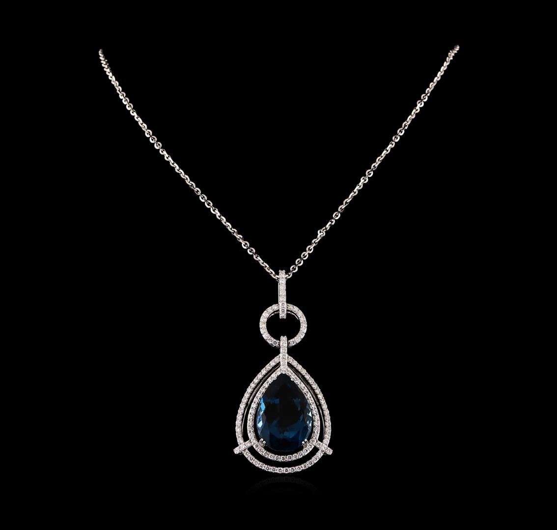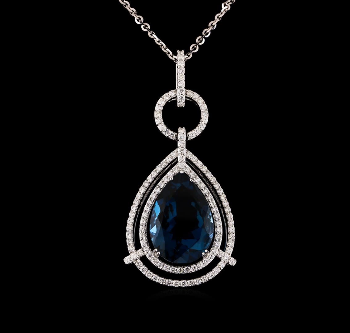 One electronically tested 14KT white gold ladies cast & assembled topaz and diamond pendant with chain. Condition is new, good workmanship. The pendant features a topaz set within a two tiered diamond bezel, completed by a diamond set bail. The pendant is supported by an eighteen inch length 14KT white gold designer style chain terminating in a lobster claw clasp. Bright polish finish. Identified with markings of "14K". Containing: One prong set pear mixed cut natural blue topaz, measuring 24.50 x 17.40 x 10.25mm, approximate weight of 29.77ct., clarity is eye clean, type I, medium dark, strong, very slightly greenish blue color, (GIA vslgB 6/5), cut is good. Transmitting light with no distortion, transparent. Graded in the setting. A deposit of a thin layer has been applied to the topaz to produce the intense color effect. The process utilizes a very high temperature treatment, diffusion of ions into the topaz, plus in some cases neutron bombardment has been used to create the color center. Diffusion processes causes the added ions to become part of the crystal surface with no distinct boundary. Do not put a gem treated in this manner into an ultrasonic cleaner. One Hundred Twenty-Six prong set round brilliant cut diamonds, measuring 1.80 - 1.70 x 1.05mm (depth est.) approximate. Total Weight of 126 Stones = 2.64ct. Graded in the setting. Clarity: I-1 to I-2. Color: F - H. Total Weight of Colored Stones 29.77ct. Total Weight of Diamonds 2.64ct. Total Weight of Pendant With Chain 26.10 grams. AIG Appraised at $11,500.00.