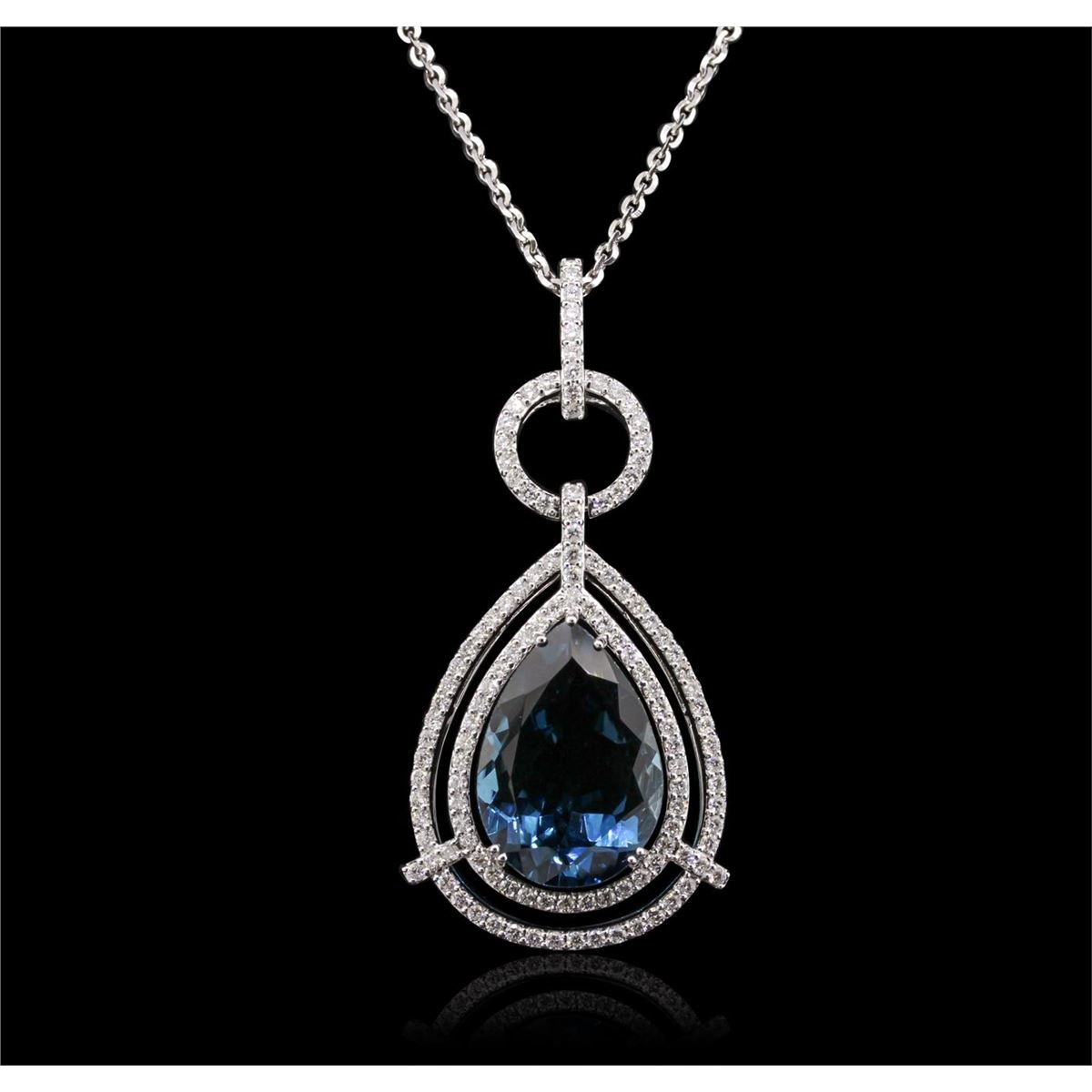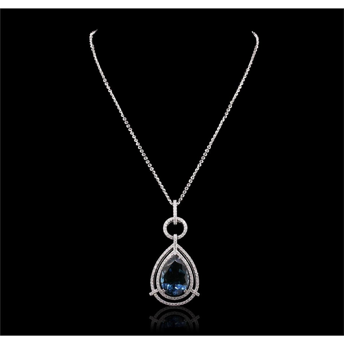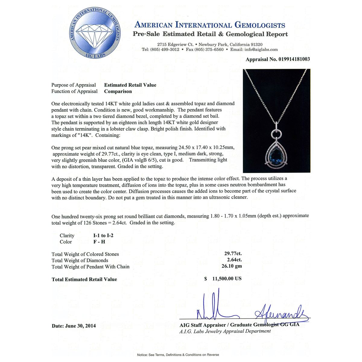 One electronically tested 14KT white gold ladies cast & assembled topaz and diamond pendant with chain. Condition is new, good workmanship. The pendant features a topaz set within a two tiered diamond bezel, completed by a diamond set bail. The pendant is supported by an eighteen inch length 14KT white gold designer style chain terminating in a lobster claw clasp. Bright polish finish. Identified with markings of "14K". Containing: One prong set pear mixed cut natural blue topaz, measuring 24.50 x 17.40 x 10.25mm, approximate weight of 29.77ct., clarity is eye clean, type I, medium dark, strong, very slightly greenish blue color, (GIA vslgB 6/5), cut is good. Transmitting light with no distortion, transparent. Graded in the setting. A deposit of a thin layer has been applied to the topaz to produce the intense color effect. The process utilizes a very high temperature treatment, diffusion of ions into the topaz, plus in some cases neutron bombardment has been used to create the color center. Diffusion processes causes the added ions to become part of the crystal surface with no distinct boundary. Do not put a gem treated in this manner into an ultrasonic cleaner. One Hundred Twenty-Six prong set round brilliant cut diamonds, measuring 1.80 - 1.70 x 1.05mm (depth est.) approximate. Total Weight of 126 Stones = 2.64ct. Graded in the setting. Clarity: I-1 to I-2. Color: F - H. Total Weight of Colored Stones 29.77ct. Total Weight of Diamonds 2.64ct. Total Weight of Pendant With Chain 26.10 grams. AIG Appraised at $11,500.00.