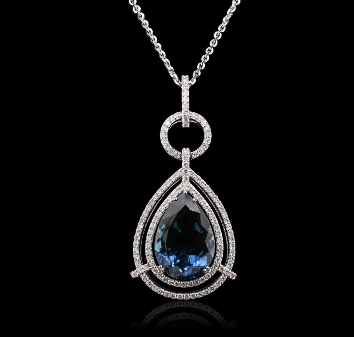 One electronically tested 14KT white gold ladies cast & assembled topaz and diamond pendant with chain. Condition is new, good workmanship. The pendant features a topaz set within a two tiered diamond bezel, completed by a diamond set bail. The pendant is supported by an eighteen inch length 14KT white gold designer style chain terminating in a lobster claw clasp. Bright polish finish. Identified with markings of "14K". Containing: One prong set pear mixed cut natural blue topaz, measuring 24.50 x 17.40 x 10.25mm, approximate weight of 29.77ct., clarity is eye clean, type I, medium dark, strong, very slightly greenish blue color, (GIA vslgB 6/5), cut is good. Transmitting light with no distortion, transparent. Graded in the setting. A deposit of a thin layer has been applied to the topaz to produce the intense color effect. The process utilizes a very high temperature treatment, diffusion of ions into the topaz, plus in some cases neutron bombardment has been used to create the color center. Diffusion processes causes the added ions to become part of the crystal surface with no distinct boundary. Do not put a gem treated in this manner into an ultrasonic cleaner. One Hundred Twenty-Six prong set round brilliant cut diamonds, measuring 1.80 - 1.70 x 1.05mm (depth est.) approximate. Total Weight of 126 Stones = 2.64ct. Graded in the setting. Clarity: I-1 to I-2. Color: F - H. Total Weight of Colored Stones 29.77ct. Total Weight of Diamonds 2.64ct. Total Weight of Pendant With Chain 26.10 grams. AIG Appraised at $11,500.00.