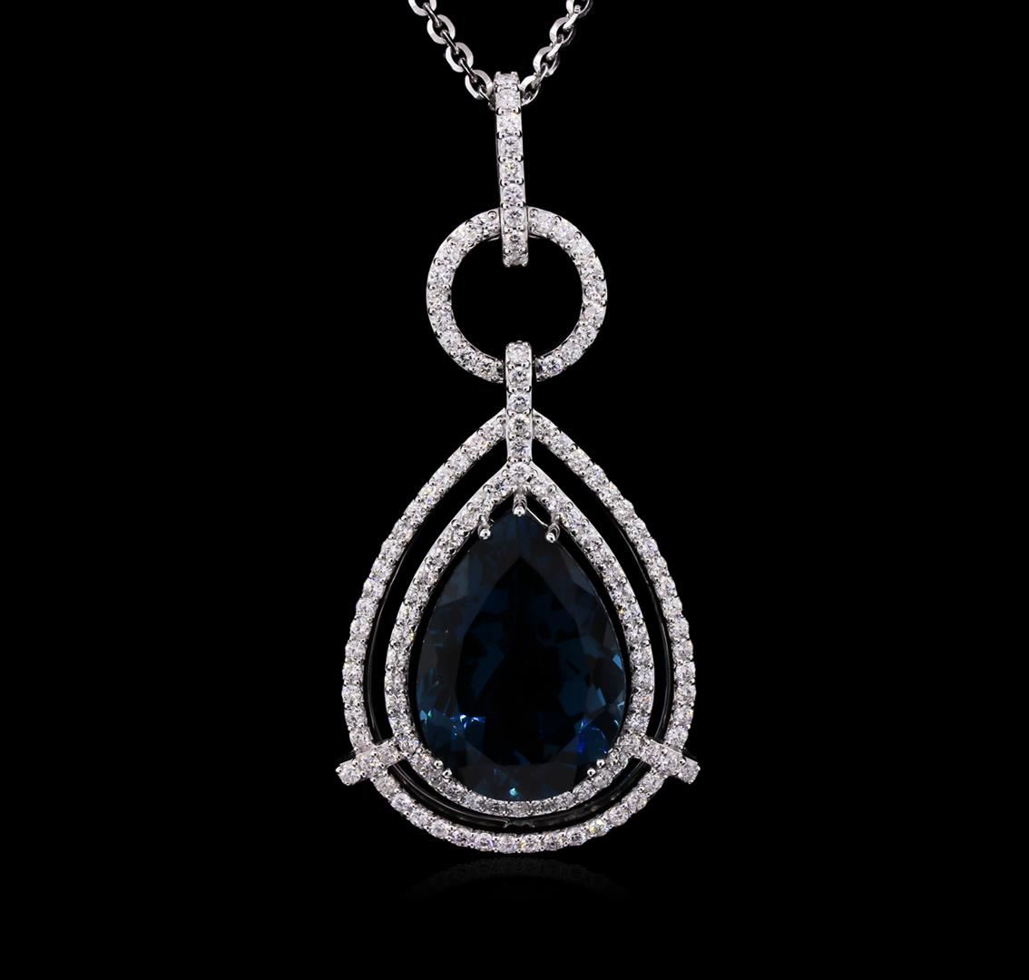 One electronically tested 14KT white gold ladies cast & assembled topaz and diamond pendant with chain. Condition is new, good workmanship. The pendant features a topaz set within a two tiered diamond bezel, completed by a diamond set bail. The pendant is supported by an eighteen inch length 14KT white gold designer style chain terminating in a lobster claw clasp. Bright polish finish. Identified with markings of "14K". Containing: One prong set pear mixed cut natural blue topaz, measuring 24.50 x 17.40 x 10.25mm, approximate weight of 29.77ct., clarity is eye clean, type I, medium dark, strong, very slightly greenish blue color, (GIA vslgB 6/5), cut is good. Transmitting light with no distortion, transparent. Graded in the setting. A deposit of a thin layer has been applied to the topaz to produce the intense color effect. The process utilizes a very high temperature treatment, diffusion of ions into the topaz, plus in some cases neutron bombardment has been used to create the color center. Diffusion processes causes the added ions to become part of the crystal surface with no distinct boundary. Do not put a gem treated in this manner into an ultrasonic cleaner. One Hundred Twenty-Six prong set round brilliant cut diamonds, measuring 1.80 - 1.70 x 1.05mm (depth est.) approximate. Total Weight of 126 Stones = 2.64ct. Graded in the setting. Clarity: I-1 to I-2. Color: F - H. Total Weight of Colored Stones 29.77ct. Total Weight of Diamonds 2.64ct. Total Weight of Pendant With Chain 26.10 grams. AIG Appraised at $11,500.00.