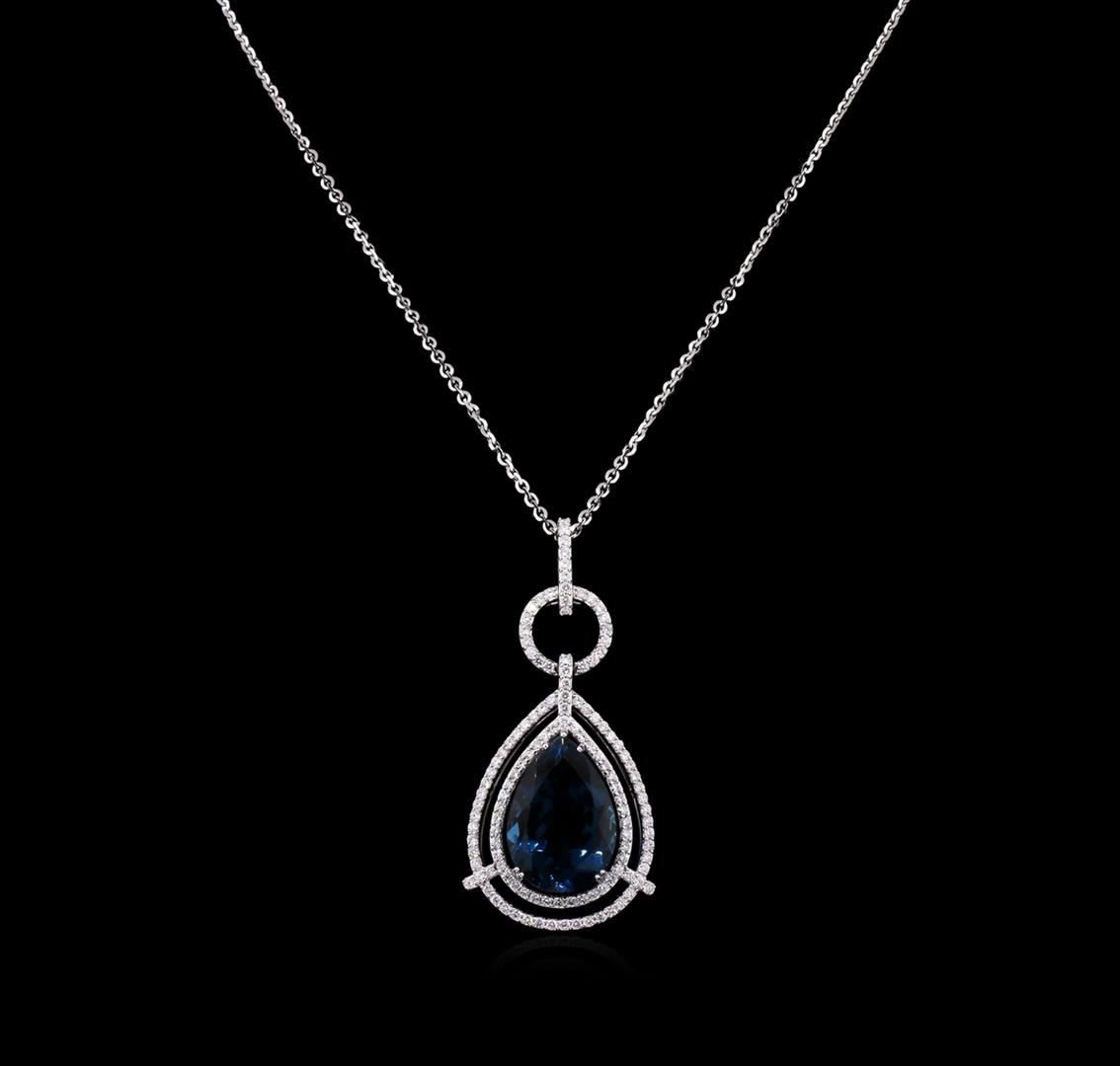 One electronically tested 14KT white gold ladies cast & assembled topaz and diamond pendant with chain. Condition is new, good workmanship. The pendant features a topaz set within a two tiered diamond bezel, completed by a diamond set bail. The pendant is supported by an eighteen inch length 14KT white gold designer style chain terminating in a lobster claw clasp. Bright polish finish. Identified with markings of "14K". Containing: One prong set pear mixed cut natural blue topaz, measuring 24.50 x 17.40 x 10.25mm, approximate weight of 29.77ct., clarity is eye clean, type I, medium dark, strong, very slightly greenish blue color, (GIA vslgB 6/5), cut is good. Transmitting light with no distortion, transparent. Graded in the setting. A deposit of a thin layer has been applied to the topaz to produce the intense color effect. The process utilizes a very high temperature treatment, diffusion of ions into the topaz, plus in some cases neutron bombardment has been used to create the color center. Diffusion processes causes the added ions to become part of the crystal surface with no distinct boundary. Do not put a gem treated in this manner into an ultrasonic cleaner. One Hundred Twenty-Six prong set round brilliant cut diamonds, measuring 1.80 - 1.70 x 1.05mm (depth est.) approximate. Total Weight of 126 Stones = 2.64ct. Graded in the setting. Clarity: I-1 to I-2. Color: F - H. Total Weight of Colored Stones 29.77ct. Total Weight of Diamonds 2.64ct. Total Weight of Pendant With Chain 26.10 grams. AIG Appraised at $11,500.00.