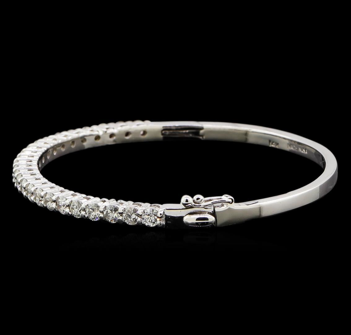 One electronically tested 14KT white gold ladies cast diamond bangle bracelet with a hidden box clasp with safety closer with a bright polish finish. Identified with markings of "14K". Condition is new. Containing: Twenty-Five prong set round brilliant cut diamonds, measuring 3.20 - 3.20 x 1.92mm (depth est.) approximate total weight of 25 Stones = 3.00ct. Clarity of SI-2 to I-1, Color of I - J, Cut is Good. All diamonds are graded in the mounting, unless otherwise stated. Total Weight of Diamonds 3.00ct. Total Weight of Bangle Bracelet 19.20 grams. GGL Appraised at $11,210.00.