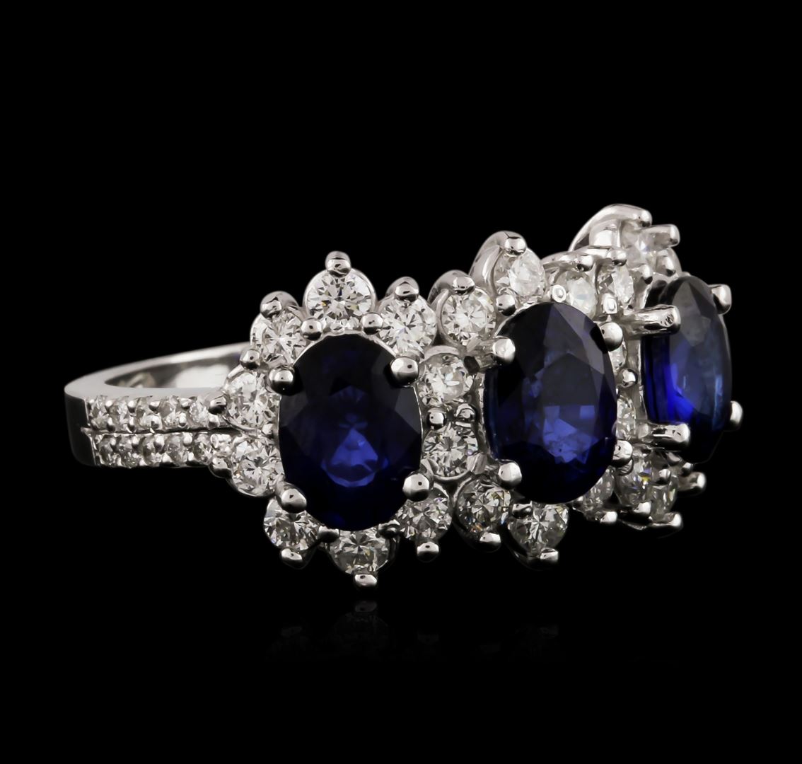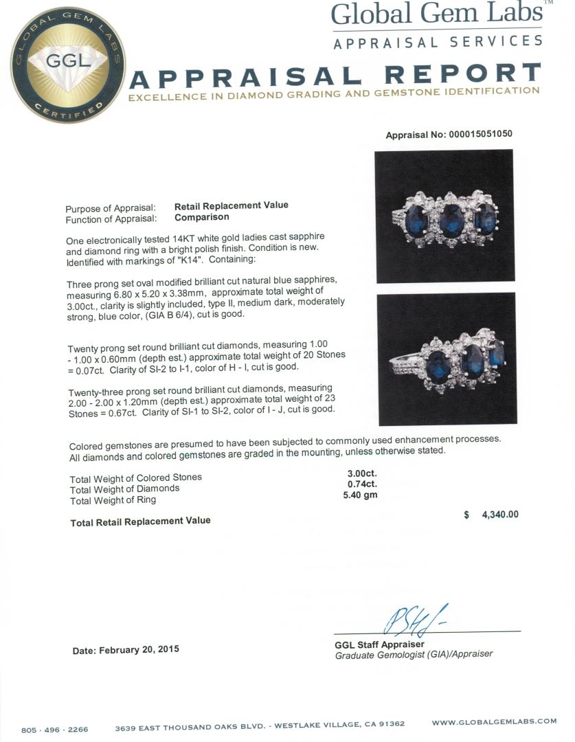 One electronically tested 14KT white gold ladies cast sapphire and diamond ring with a bright polish finish. Identified with markings of "K14". Condition is new. Containing: Three prong set oval modified brilliant cut natural blue sapphires, measuring 6.80 x 5.20 x 3.38mm, approximate total weight of 3.00ct., clarity is slightly included, type II, medium dark, moderately strong, blue color, (GIA B 6/4), cut is good. Twenty prong set round brilliant cut diamonds, measuring 1.00 - 1.00 x 0.60mm (depth est.) approximate total weight of 20 Stones = 0.07ct. Clarity: SI-2 to I-1. Color: H - I, Cut is Good. Twenty-Three prong set round brilliant cut diamonds, measuring 2.00 - 2.00 x 1.20mm (depth est.) approximate total weight of 23 Stones = 0.67ct. Clarity: SI-1 to SI-2. Color: I - J, Cut is Good. Colored gemstones are presumed to have been subjected to commonly used enhancement processes. All diamonds and colored gemstones are graded in the mounting, unless otherwise stated. Total Weight of Colored Stones 3.00ct. Total Weight of Diamonds 0.74ct. Total Weight of Ring 5.40 grams. GGL Appraised at $4,340.00.