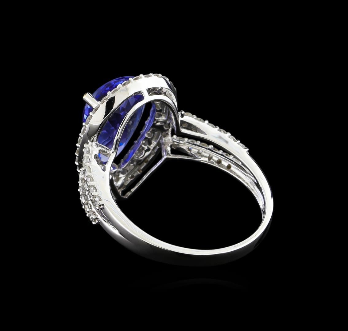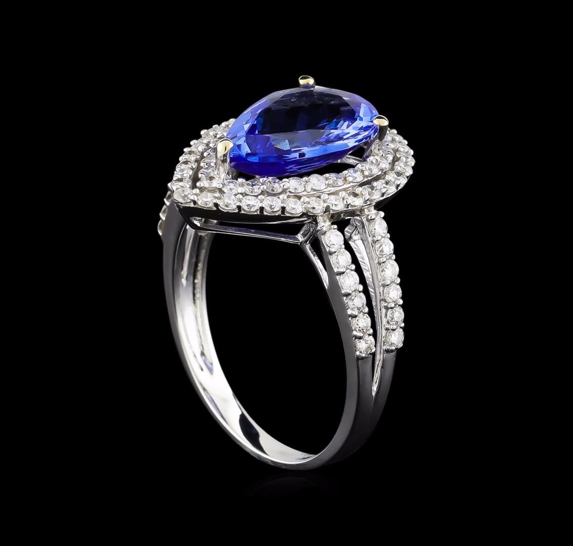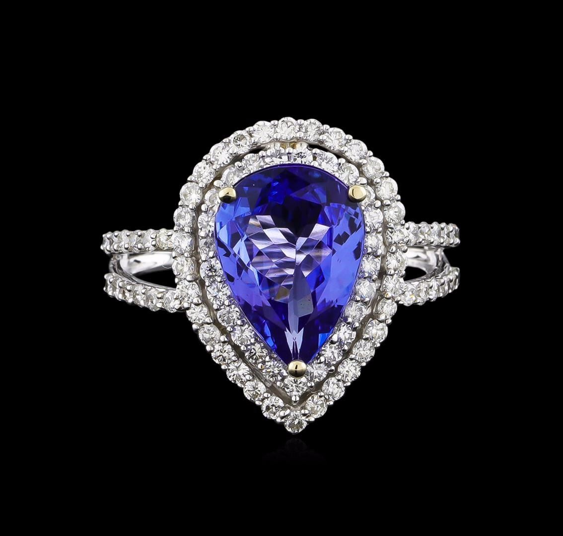 One electronically tested 14KT white gold ladies combination cast & assembled tanzanite and diamond ring with a split shank with a bright polish finish. Identified with markings of "14K". Condition is new. Containing: One prong set pear modified brilliant cut natural tanzanite, measuring 12.00 x 8.65 x 4.33mm, approximate weight of 3.01ct., clarity is eye clean, type I, medium, very slightly grayish, violet color, (GIA V 5/3), cut is good. Eighty-One prong set round brilliant cut diamonds, measuring 1.30 - 1.30 x 0.78mm (depth est.) approximate total weight of 81 Stones = 0.65ct. Clarity: I-1 to I-2. Color: I - J, Cut is Good. Colored gemstones are presumed to have been subjected to commonly used enhancement processes. All diamonds and colored gemstones are graded in the mounting, unless otherwise stated. Total Weight of Colored Stones 3.01ct. Total Weight of Diamonds 0.65ct. Total Weight of Ring 4.20 grams. GGL Appraised at $6,595.00.