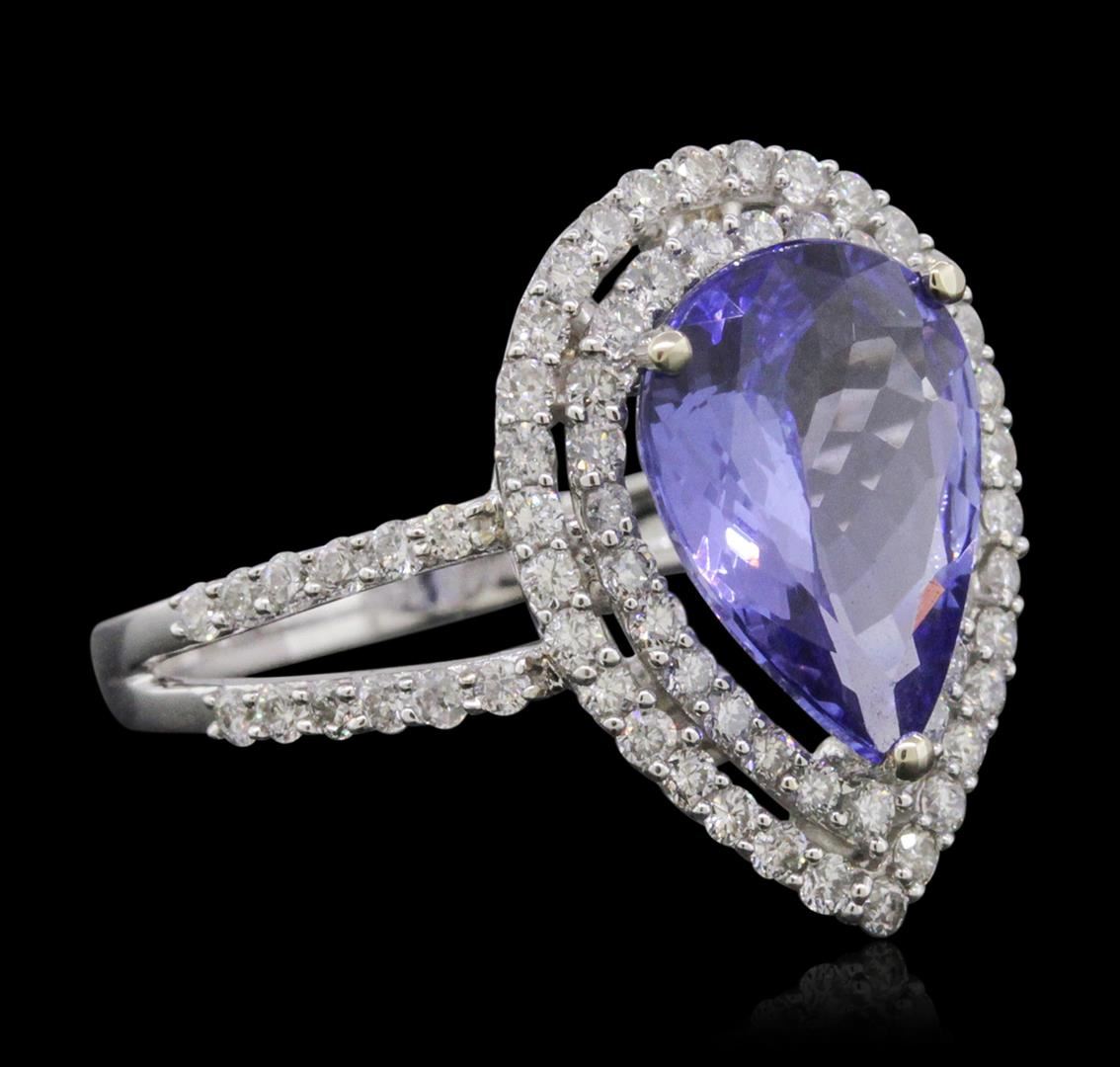 One electronically tested 14KT white gold ladies combination cast & assembled tanzanite and diamond ring with a split shank with a bright polish finish. Identified with markings of "14K". Condition is new. Containing: One prong set pear modified brilliant cut natural tanzanite, measuring 12.00 x 8.65 x 4.33mm, approximate weight of 3.01ct., clarity is eye clean, type I, medium, very slightly grayish, violet color, (GIA V 5/3), cut is good. Eighty-One prong set round brilliant cut diamonds, measuring 1.30 - 1.30 x 0.78mm (depth est.) approximate total weight of 81 Stones = 0.65ct. Clarity: I-1 to I-2. Color: I - J, Cut is Good. Colored gemstones are presumed to have been subjected to commonly used enhancement processes. All diamonds and colored gemstones are graded in the mounting, unless otherwise stated. Total Weight of Colored Stones 3.01ct. Total Weight of Diamonds 0.65ct. Total Weight of Ring 4.20 grams. GGL Appraised at $6,595.00.