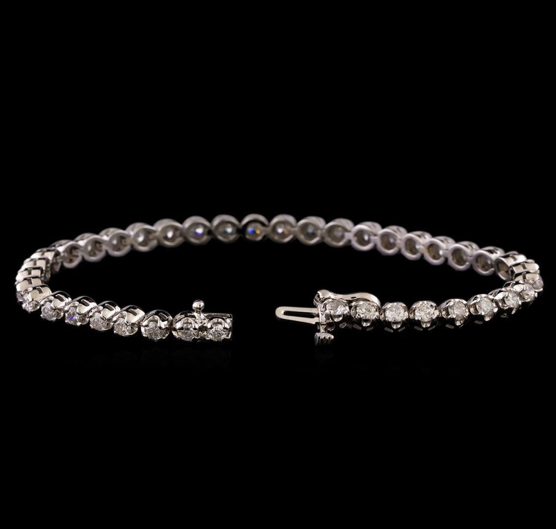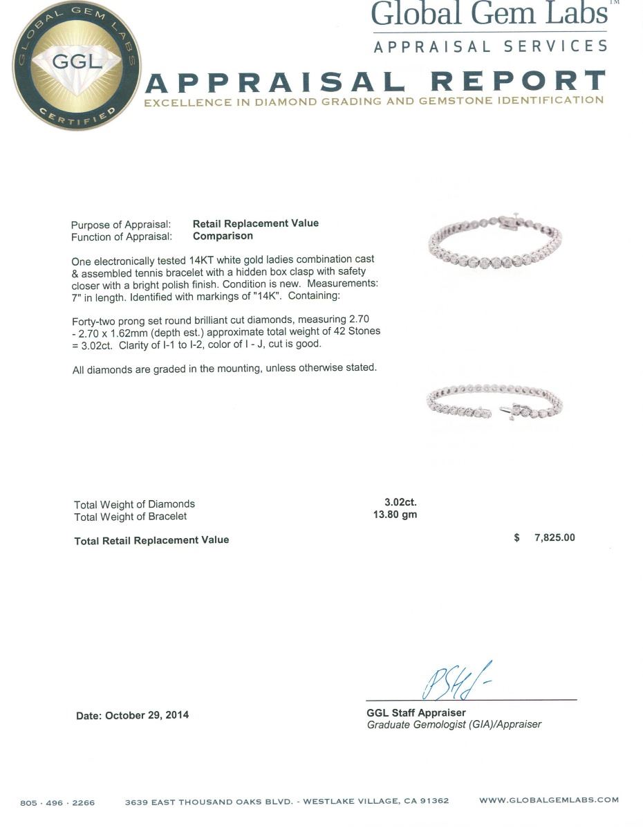 One electronically tested 14KT white gold ladies combination cast & assembled tennis bracelet with a hidden box clasp with safety closer with a bright polish finish. Measurements: 7 in length. Identified with markings of 14K. Condition is new. Containing: Forty-Two prong set round brilliant cut diamonds, measuring 2.70 - 2.70 x 1.62mm (depth est.) approximate total weight of 42 Stones = 3.02ct. Clarity: I-1 to I-2. Color: I - J, Cut is Good. All diamonds are graded in the mounting, unless otherwise stated. Total Weight of Diamonds 3.02ct. Total Weight of Bracelet 13.80 grams. GGL Appraised at $7,825.00.