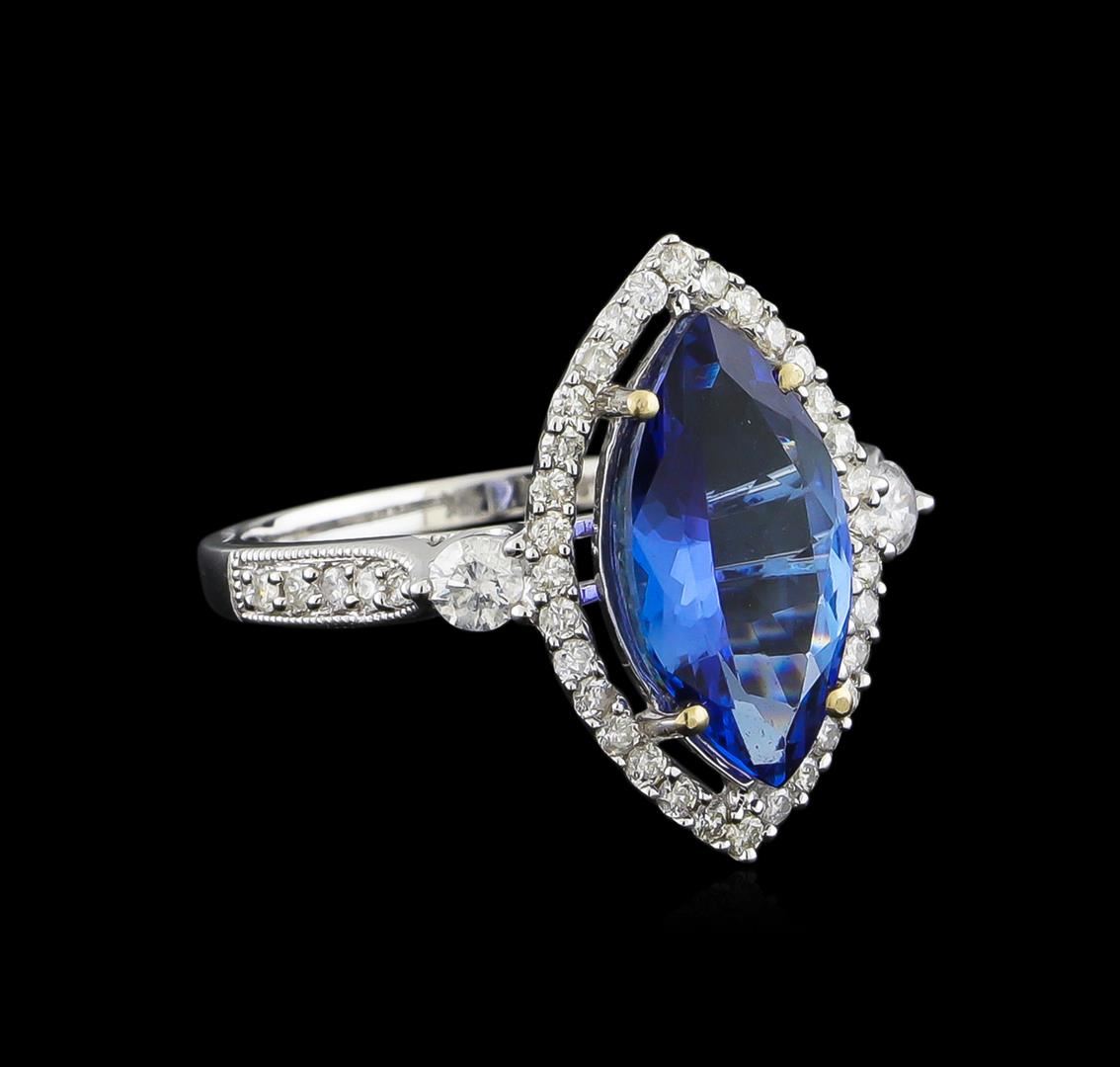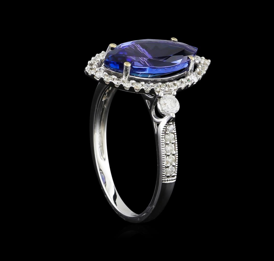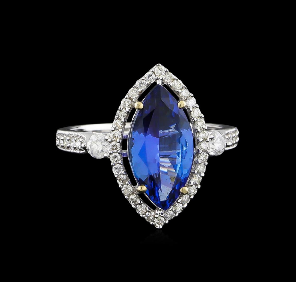 One electronically tested 14KT white gold ladies cast tanzanite and diamond ring. The featured tanzanite is set within a diamond bezel supported by diamond set shoulders, completed by a one and one-half millimeter wide band. Bright polish finish with milgrain detailing. Trademark is Orianne. Identified with markings of "14K". Condition is new, good workmanship. Containing: One prong set marquise brilliant cut natural tanzanite, measuring 14.00 x 7.10 x 4.50mm, 6% bulge factor, approximate weight of 3.02ct., clarity is eye clean, type I, medium dark, slightly grayish, bluish violet color, (GIA bV 6/2), cut is good. Transmitting light with no distortion, transparent. Graded in the setting. Tanzanite is a very rare gemstone that is only found in the country of Tanzania. Originally discovered in 1967. Tiffany & Company, named the stone Tanzanite. It is found in the Usumburu Mountains that border the Umba Valley of northern Tanzania. Tanzanite occurs in gray, brown, violet, blue, reddish-purple, & green. The gem is interesting because of its exceptional pleochroism. Rotated in different directions a tanzanite will exhibit multiple changes of color. Tanzanite has a low tolerance to ultrasonic cleaning, and should not be cleaned using this method. Forty-Four prong set round brilliant cut diamonds, measuring 2.70 - 1.20 x 1.17mm (depth est.) approximate total weight of 44 Stones = 0.54ct. Graded in the setting. Clarity: I-1 to I-2. Color: G - I. Total Weight of Colored Stones 3.02ct. Total Weight of Diamonds 0.54ct. Total Weight of Ring 3.13 grams. AIG Appraised at $7,700.00.