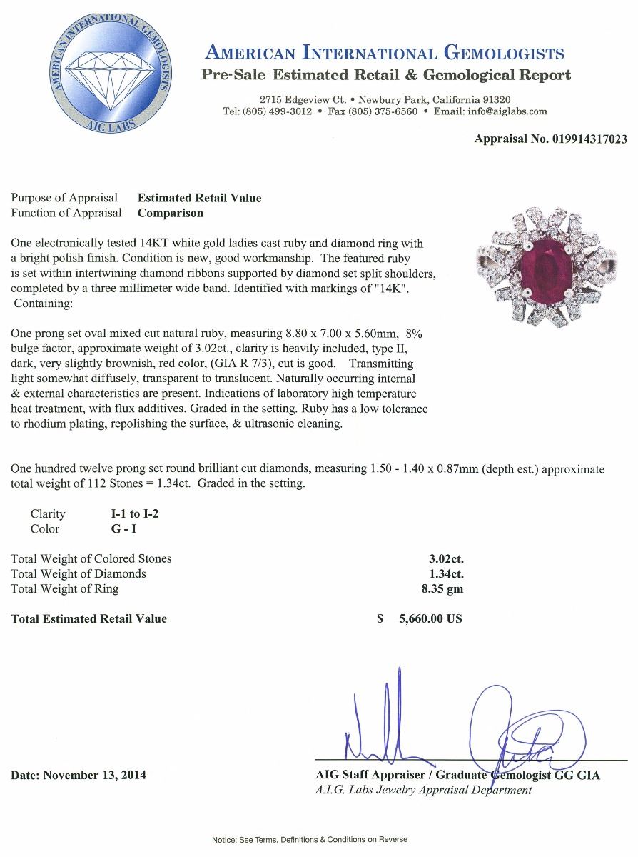 One electronically tested 14KT white gold ladies cast ruby and diamond ring with a bright polish finish. The featured ruby is set within intertwining diamond ribbons supported by diamond set split shoulders, completed by a three millimeter wide band. Identified with markings of "14K". Condition is new, good workmanship. Containing: One prong set oval mixed cut natural ruby, measuring 8.80 x 7.00 x 5.60mm, 8% bulge factor, approximate weight of 3.02ct., clarity is heavily included, type II, dark, very slightly brownish, red color, (GIA R 7/3), cut is good. Transmitting light somewhat diffusely, transparent to translucent. Naturally occurring internal& external characteristics are present. Indications of laboratory high temperature heat treatment, with flux additives. Graded in the setting. Ruby has a low tolerance to rhodium plating, repolishing the surface, & ultrasonic cleaning. One Hundred Twelve prong set round brilliant cut diamonds, measuring 1.50 - 1.40 x 0.87mm (depth est.) approximate total weight of 112 Stones = 1.34ct. Graded in the setting. Clarity I-1 to I-2. Color G -- I. Total Weight of Colored Stones 3.02ct. Total Weight of Diamonds 1.34ct. Total Weight of Ring 8.35 grams. AIG Appraised at $5,660.00.