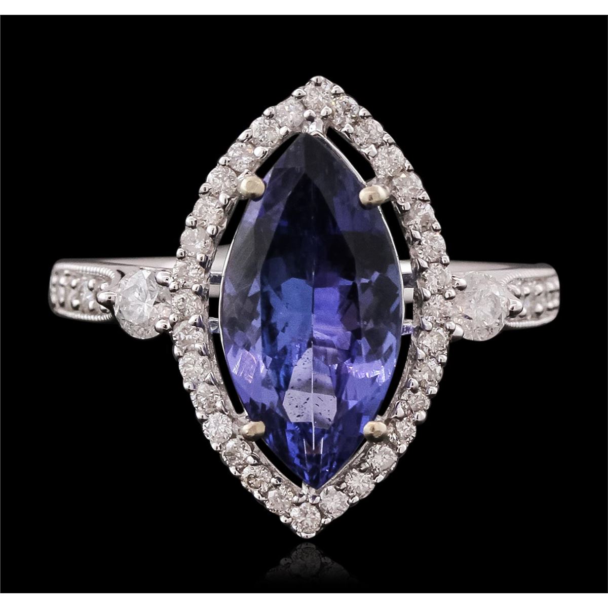 One electronically tested 14KT white gold ladies cast tanzanite and diamond ring. The featured tanzanite is set within a diamond bezel supported by diamond set shoulders, completed by a one and one-half millimeter wide band. Bright polish finish with milgrain detailing. Trademark is Orianne. Identified with markings of "14K". Condition is new, good workmanship. Containing: One prong set marquise brilliant cut natural tanzanite, measuring 14.00 x 7.10 x 4.50mm, 6% bulge factor, approximate weight of 3.02ct., clarity is eye clean, type I, medium dark, slightly grayish, bluish violet color, (GIA bV 6/2), cut is good. Transmitting light with no distortion, transparent. Graded in the setting. Tanzanite is a very rare gemstone that is only found in the country of Tanzania. Originally discovered in 1967. Tiffany & Company, named the stone Tanzanite. It is found in the Usumburu Mountains that border the Umba Valley of northern Tanzania. Tanzanite occurs in gray, brown, violet, blue, reddish-purple, & green. The gem is interesting because of its exceptional pleochroism. Rotated in different directions a tanzanite will exhibit multiple changes of color. Tanzanite has a low tolerance to ultrasonic cleaning, and should not be cleaned using this method. Forty-Four prong set round brilliant cut diamonds, measuring 2.70 - 1.20 x 1.17mm (depth est.) approximate total weight of 44 Stones = 0.54ct. Graded in the setting. Clarity: I-1 to I-2. Color: G - I. Total Weight of Colored Stones 3.02ct. Total Weight of Diamonds 0.54ct. Total Weight of Ring 3.13 grams. AIG Appraised at $7,700.00.