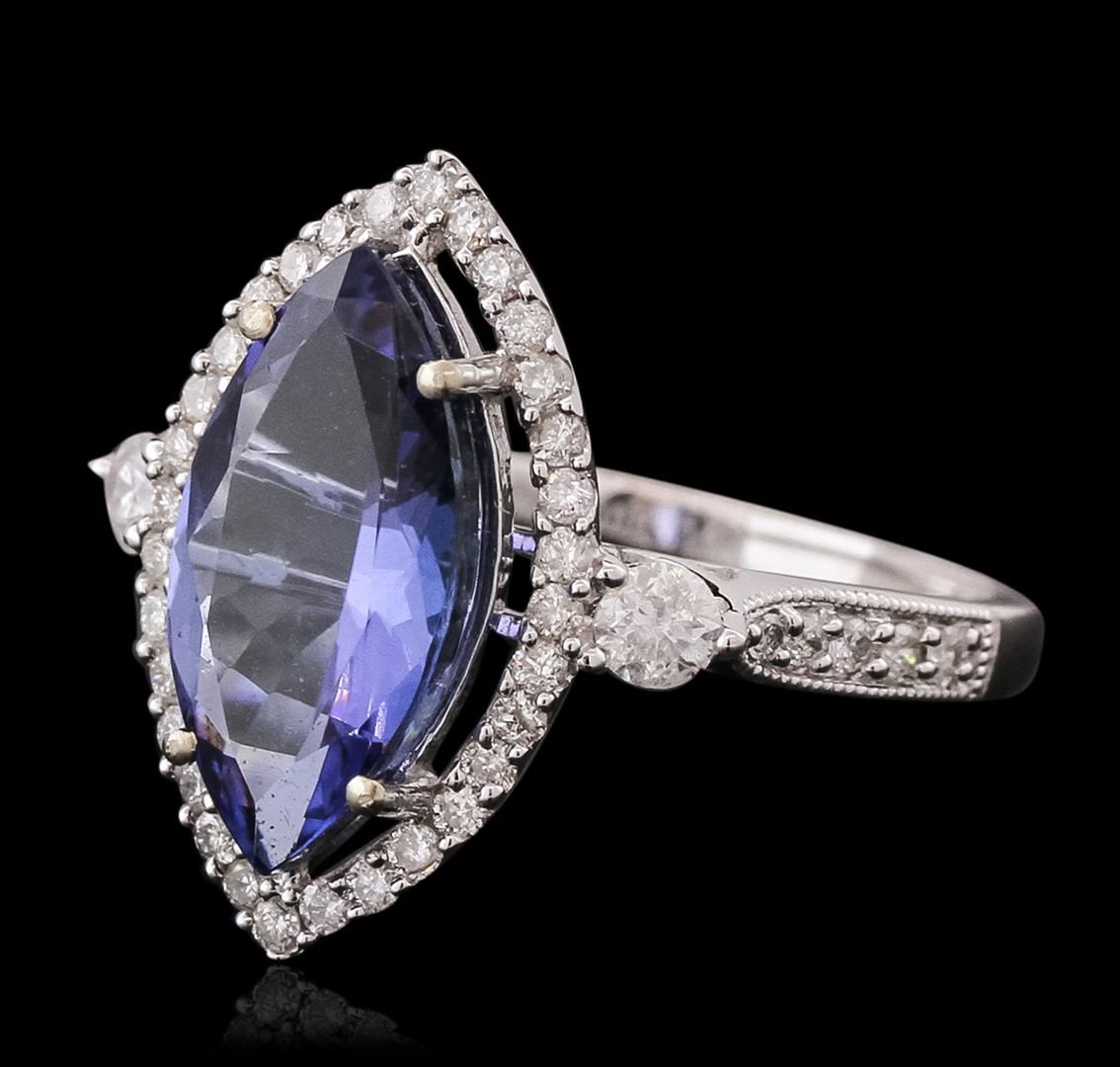 One electronically tested 14KT white gold ladies cast tanzanite and diamond ring. The featured tanzanite is set within a diamond bezel supported by diamond set shoulders, completed by a one and one-half millimeter wide band. Bright polish finish with milgrain detailing. Trademark is Orianne. Identified with markings of "14K". Condition is new, good workmanship. Containing: One prong set marquise brilliant cut natural tanzanite, measuring 14.00 x 7.10 x 4.50mm, 6% bulge factor, approximate weight of 3.02ct., clarity is eye clean, type I, medium dark, slightly grayish, bluish violet color, (GIA bV 6/2), cut is good. Transmitting light with no distortion, transparent. Graded in the setting. Tanzanite is a very rare gemstone that is only found in the country of Tanzania. Originally discovered in 1967. Tiffany & Company, named the stone Tanzanite. It is found in the Usumburu Mountains that border the Umba Valley of northern Tanzania. Tanzanite occurs in gray, brown, violet, blue, reddish-purple, & green. The gem is interesting because of its exceptional pleochroism. Rotated in different directions a tanzanite will exhibit multiple changes of color. Tanzanite has a low tolerance to ultrasonic cleaning, and should not be cleaned using this method. Forty-Four prong set round brilliant cut diamonds, measuring 2.70 - 1.20 x 1.17mm (depth est.) approximate total weight of 44 Stones = 0.54ct. Graded in the setting. Clarity: I-1 to I-2. Color: G - I. Total Weight of Colored Stones 3.02ct. Total Weight of Diamonds 0.54ct. Total Weight of Ring 3.13 grams. AIG Appraised at $7,700.00.