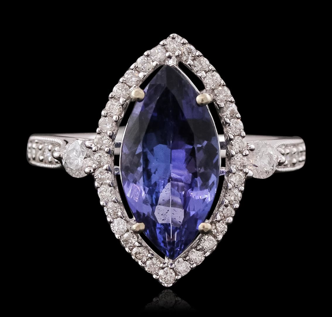 One electronically tested 14KT white gold ladies cast tanzanite and diamond ring. The featured tanzanite is set within a diamond bezel supported by diamond set shoulders, completed by a one and one-half millimeter wide band. Bright polish finish with milgrain detailing. Trademark is Orianne. Identified with markings of "14K". Condition is new, good workmanship. Containing: One prong set marquise brilliant cut natural tanzanite, measuring 14.00 x 7.10 x 4.50mm, 6% bulge factor, approximate weight of 3.02ct., clarity is eye clean, type I, medium dark, slightly grayish, bluish violet color, (GIA bV 6/2), cut is good. Transmitting light with no distortion, transparent. Graded in the setting. Tanzanite is a very rare gemstone that is only found in the country of Tanzania. Originally discovered in 1967. Tiffany & Company, named the stone Tanzanite. It is found in the Usumburu Mountains that border the Umba Valley of northern Tanzania. Tanzanite occurs in gray, brown, violet, blue, reddish-purple, & green. The gem is interesting because of its exceptional pleochroism. Rotated in different directions a tanzanite will exhibit multiple changes of color. Tanzanite has a low tolerance to ultrasonic cleaning, and should not be cleaned using this method. Forty-Four prong set round brilliant cut diamonds, measuring 2.70 - 1.20 x 1.17mm (depth est.) approximate total weight of 44 Stones = 0.54ct. Graded in the setting. Clarity: I-1 to I-2. Color: G - I. Total Weight of Colored Stones 3.02ct. Total Weight of Diamonds 0.54ct. Total Weight of Ring 3.13 grams. AIG Appraised at $7,700.00.