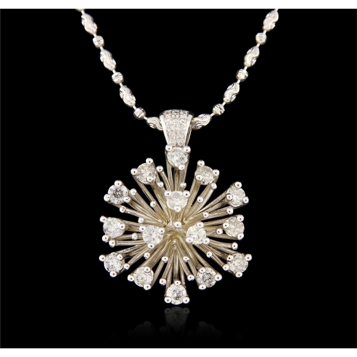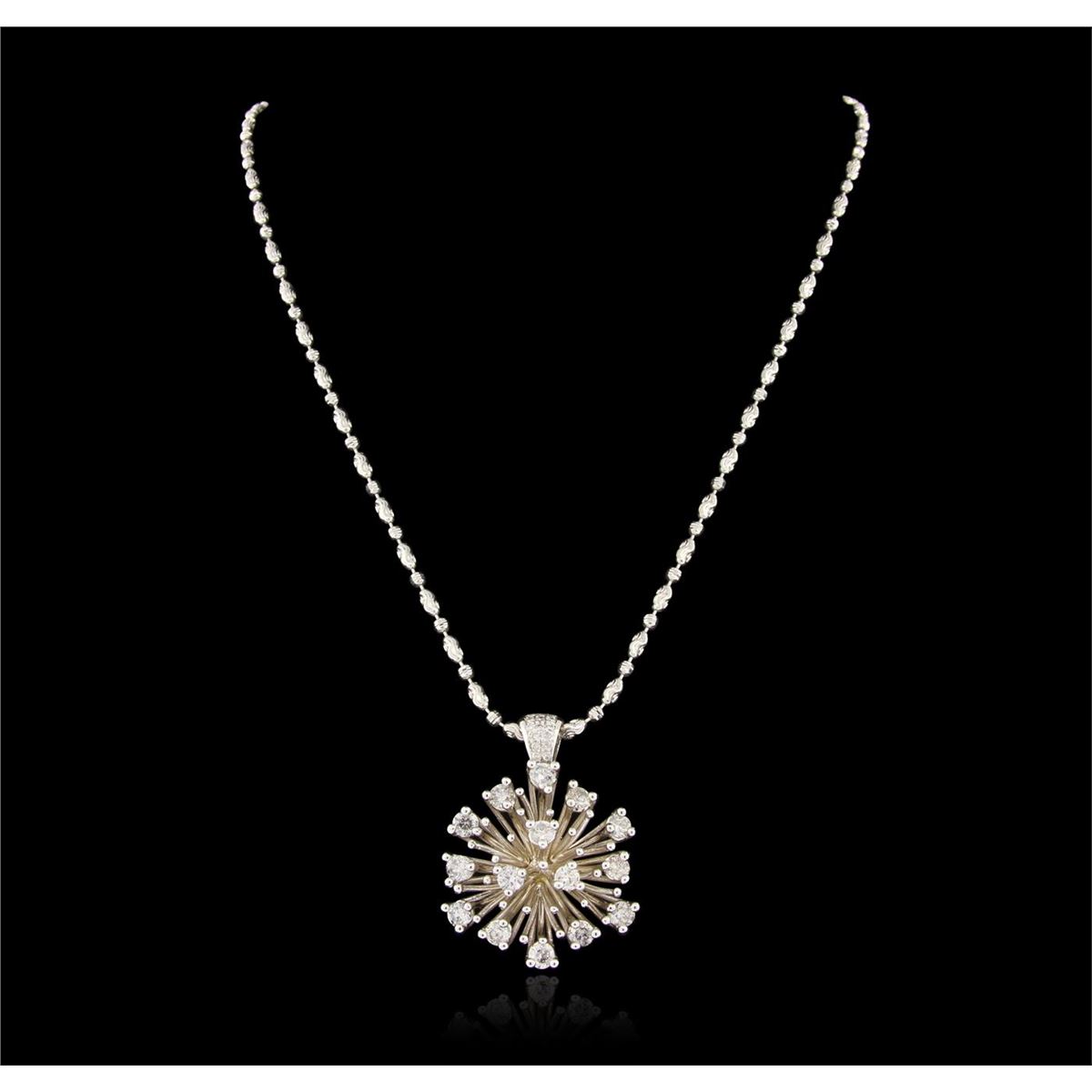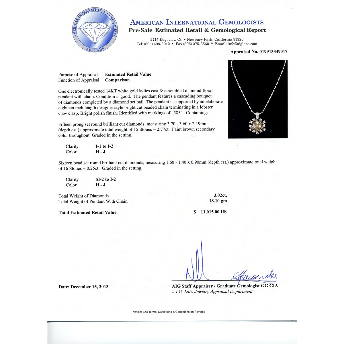 One electronically tested 14KT white gold ladies cast & assembled diamond floral pendant with chain. The pendant features a cascading bouquet of diamonds completed by a diamond set bail. The pendant is supported by an elaborate eighteen inch length designer style bright cut beaded chain terminating in a lobster claw clasp. Bright polish finish. Identified with markings of "585". Condition is good. Containing: Fifteen prong set round brilliant cut diamonds, measuring 3.70 - 3.60 x 2.19mm (depth est.) approximate. Total Weight of 15 Stones = 2.77ct. Faint brown secondary color throughout. Graded in the setting. Clarity: I-1 to I-2. Color: H - J Sixteen bead set round brilliant cut diamonds, measuring 1.60 - 1.40 x 0.90mm (depth est.) approximate. Total Weight of 16 Stones = 0.25ct. Graded in the setting. Clarity: SI-2 to I-2. Color: H - J. Total Weight of Diamonds 3.02ct. AIG Appraised at $11,015.00.