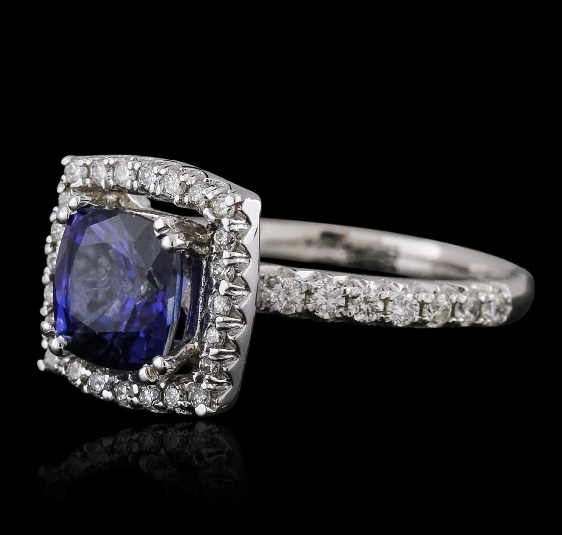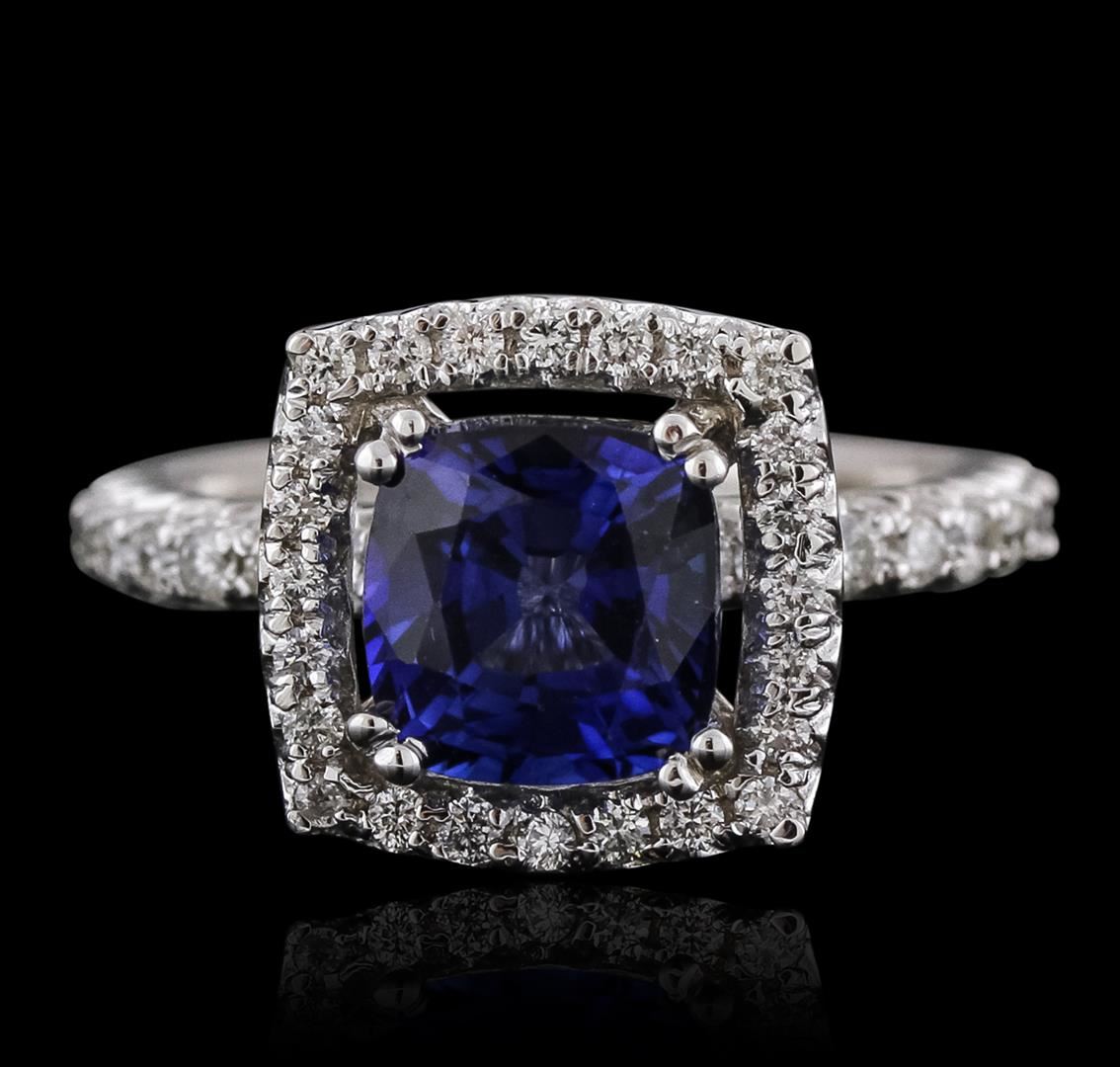 One electronically tested 14KT white gold ladies combination cast & assembled sapphire and diamond ring with a flat shank with a bright polish finish. Identified with markings of "K14". Condition is new. Containing: One prong set square cushion modified brilliant cut natural blue sapphire, measuring 7.95 x 7.88 x 5.15mm, approximate weight of 3.03ct., clarity is eye clean, type II, medium, moderately strong, blue color, (GIA B 5/4), cut is good. Fifty-Six prong set round brilliant cut diamonds, measuring 1.60 - 1.10 x 0.81mm (depth est.) approximate total weight of 56 Stones = 0.50ct. Clarity: SI-1 to SI-2. Color: I - J, Cut is Good. Colored gemstones are presumed to have been subjected to commonly used enhancement processes. All diamonds and colored gemstones are graded in the mounting, unless otherwise stated. Total Weight of Colored Stones 3.03ct. Total Weight of Diamonds 0.50ct. Total Weight of Ring 5.70 grams. GGL Appraised at $5,010.00.