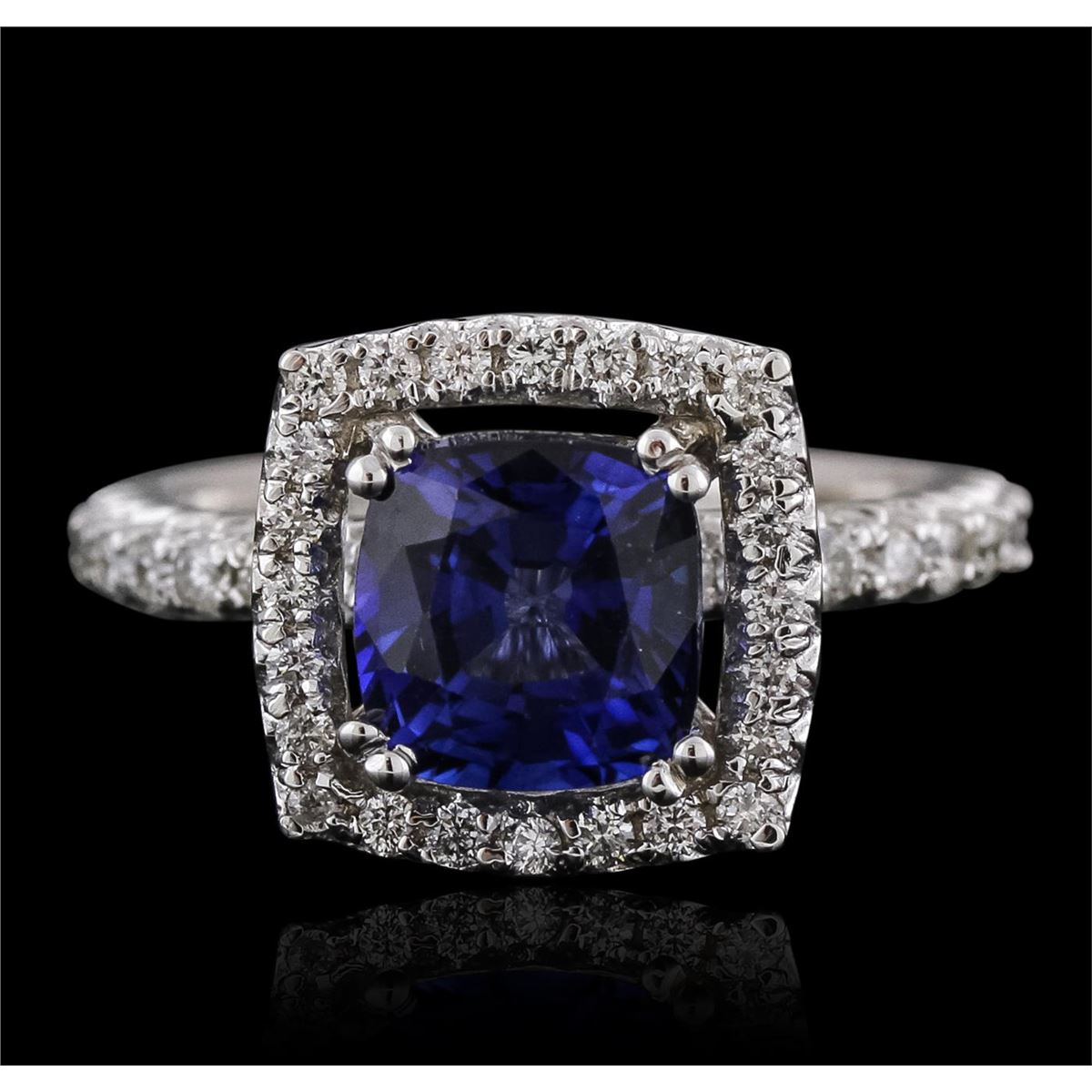 One electronically tested 14KT white gold ladies combination cast & assembled sapphire and diamond ring with a flat shank with a bright polish finish. Identified with markings of "K14". Condition is new. Containing: One prong set square cushion modified brilliant cut natural blue sapphire, measuring 7.95 x 7.88 x 5.15mm, approximate weight of 3.03ct., clarity is eye clean, type II, medium, moderately strong, blue color, (GIA B 5/4), cut is good. Fifty-Six prong set round brilliant cut diamonds, measuring 1.60 - 1.10 x 0.81mm (depth est.) approximate total weight of 56 Stones = 0.50ct. Clarity: SI-1 to SI-2. Color: I - J, Cut is Good. Colored gemstones are presumed to have been subjected to commonly used enhancement processes. All diamonds and colored gemstones are graded in the mounting, unless otherwise stated. Total Weight of Colored Stones 3.03ct. Total Weight of Diamonds 0.50ct. Total Weight of Ring 5.70 grams. GGL Appraised at $5,010.00.