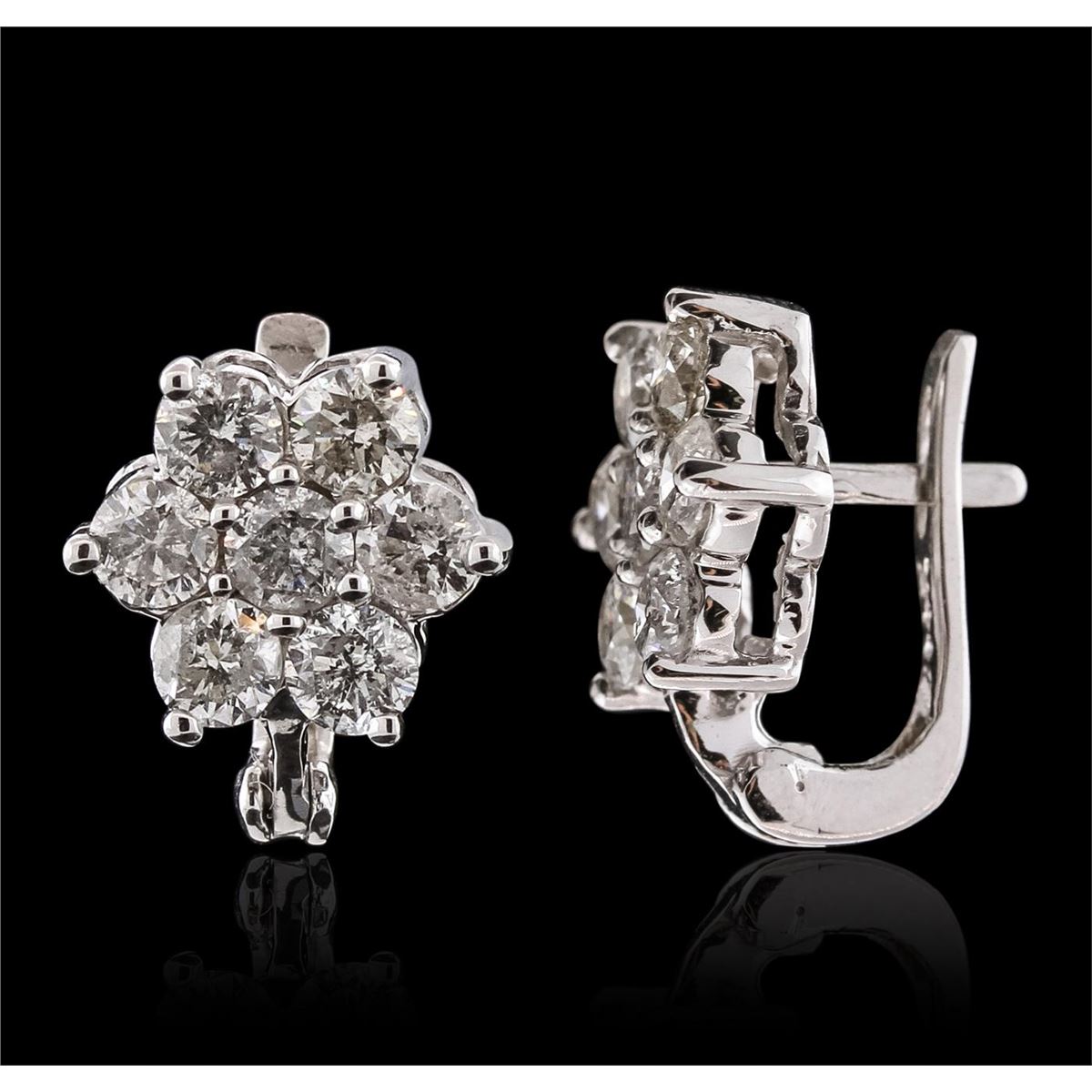 One pair electronically tested 14KT white gold ladies combination cast & assembled earrings with clip backs with a bright polish finish. Identified with markings of "14K". Condition is new. Containing: Fourteen prong set round brilliant cut diamonds, measuring 3.90 - 3.90 x 2.34mm (depth est.) approximate total weight of 14 Stones = 3.04ct. Clarity: I-1 to I-2. Color: I - J, Cut is Good. All diamonds are graded in the mounting, unless otherwise stated. Total Weight of Diamonds 3.04ct. Total Weight of Earrings 6.10 grams. GGL Appraised at $8,720.00.