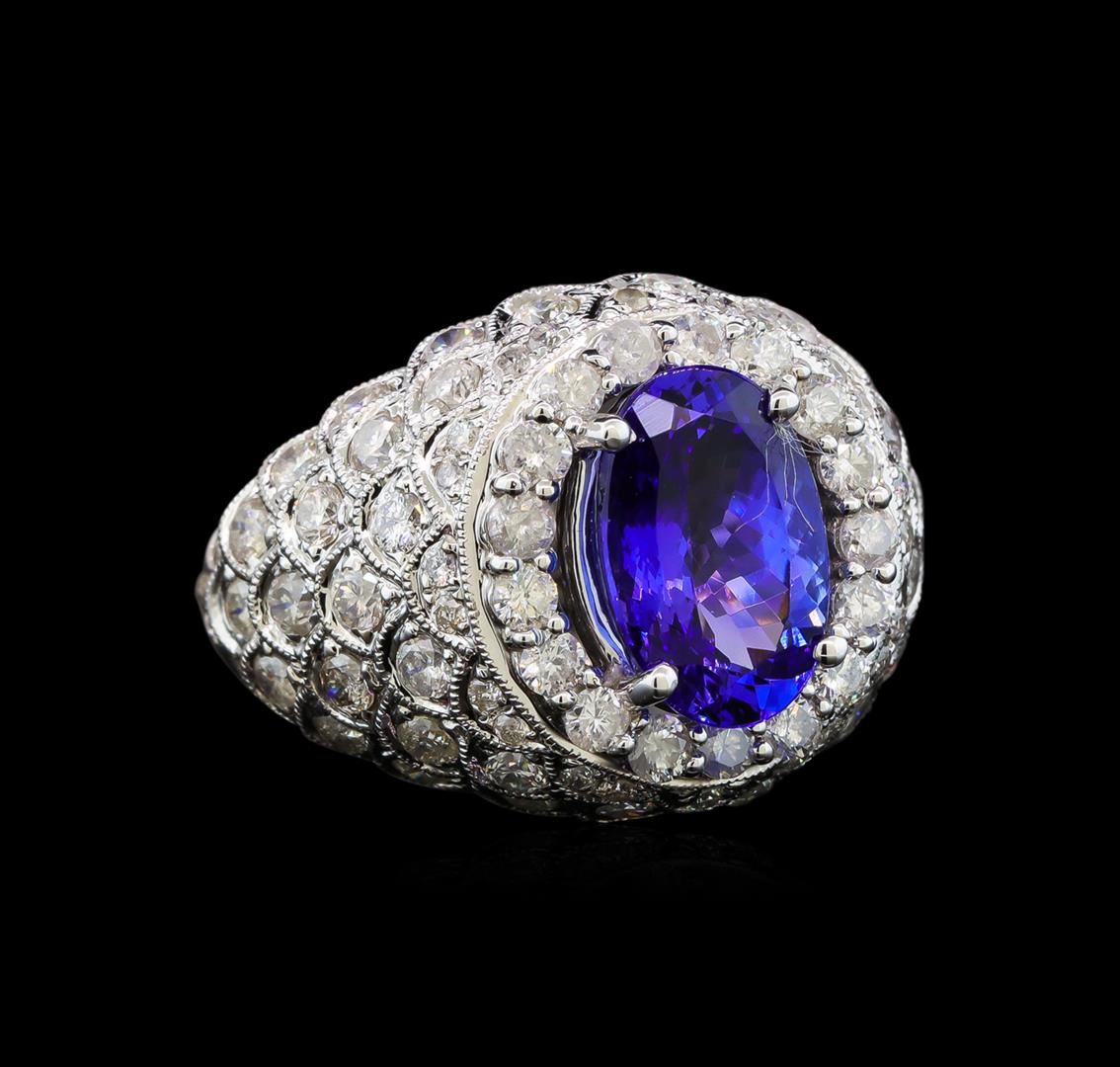 One electronically tested 14KT white gold ladies cast tanzanite and diamond ring with a bright polish finish. Identified with markings of "14K". Condition is new. Containing: One prong set oval modified brilliant cut natural tanzanite, measuring 11.50 x 7.60 x 4.95mm, approximate weight of 3.04ct., clarity is eye clean, type I, medium light, very slightly grayish, violetish blue color, (GIA vB 4/3), cut is good. Eighty prong set round brilliant cut diamonds, measuring 1.90 - 1.20 x 0.93mm (depth est.) approximate total weight of 80 Stones = 1.09ct. Clarity: SI-2 to I-2. Color: I - J. All diamonds and colored gemstones are graded in the mounting, unless otherwise stated. Colored gemstones are presumed to have been subjected to commonly used enhancement processes. Total Weight of Colored Stones 3.04ct. Total Weight of Diamonds 1.09ct. Total Weight of Ring 10.40 grams. GGL Appraised at $7,350.00.