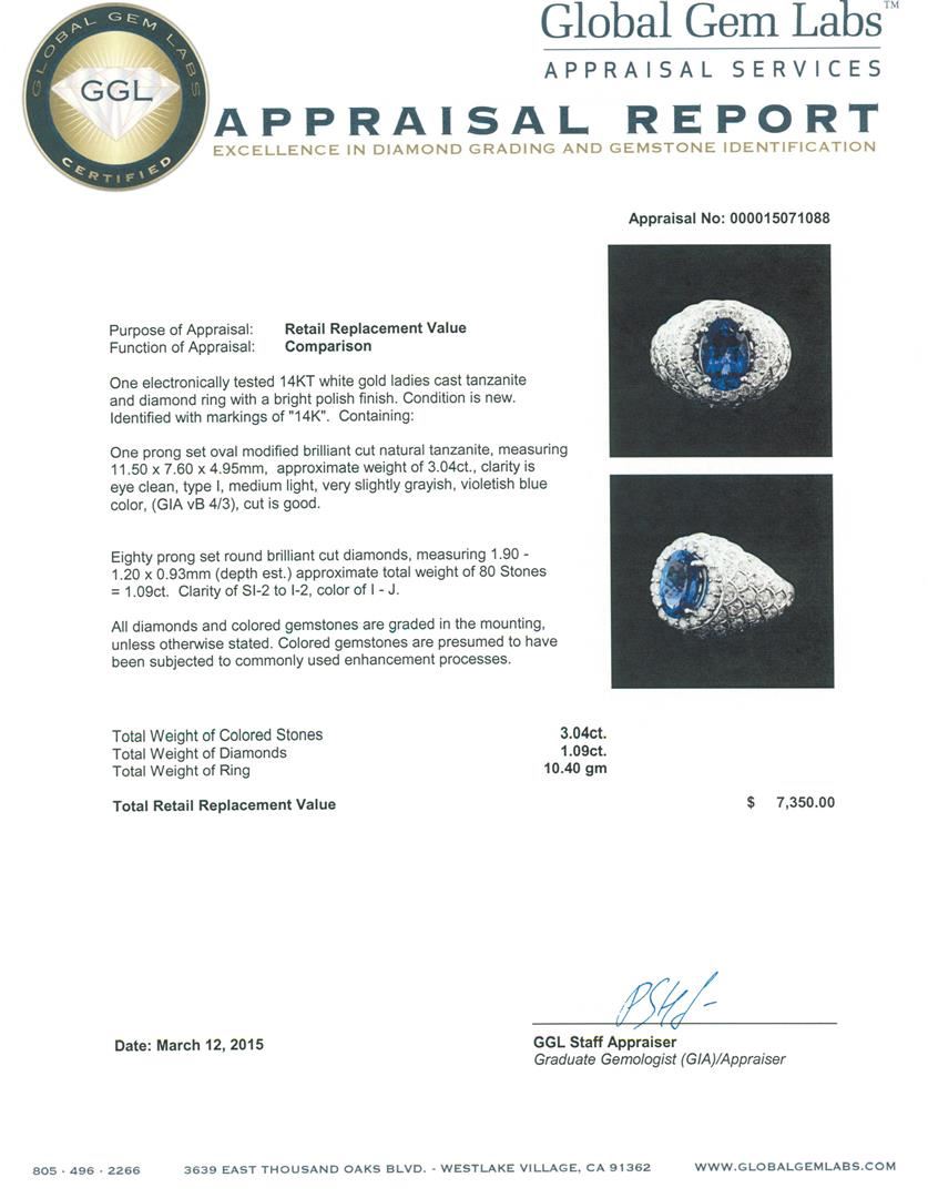One electronically tested 14KT white gold ladies cast tanzanite and diamond ring with a bright polish finish. Identified with markings of "14K". Condition is new. Containing: One prong set oval modified brilliant cut natural tanzanite, measuring 11.50 x 7.60 x 4.95mm, approximate weight of 3.04ct., clarity is eye clean, type I, medium light, very slightly grayish, violetish blue color, (GIA vB 4/3), cut is good. Eighty prong set round brilliant cut diamonds, measuring 1.90 - 1.20 x 0.93mm (depth est.) approximate total weight of 80 Stones = 1.09ct. Clarity: SI-2 to I-2. Color: I - J. All diamonds and colored gemstones are graded in the mounting, unless otherwise stated. Colored gemstones are presumed to have been subjected to commonly used enhancement processes. Total Weight of Colored Stones 3.04ct. Total Weight of Diamonds 1.09ct. Total Weight of Ring 10.40 grams. GGL Appraised at $7,350.00.