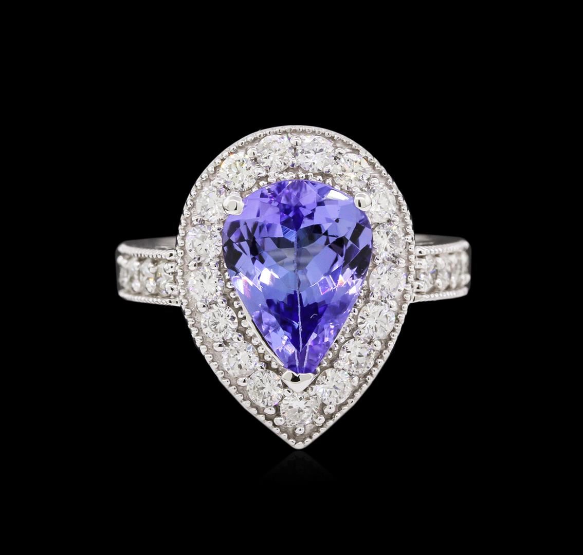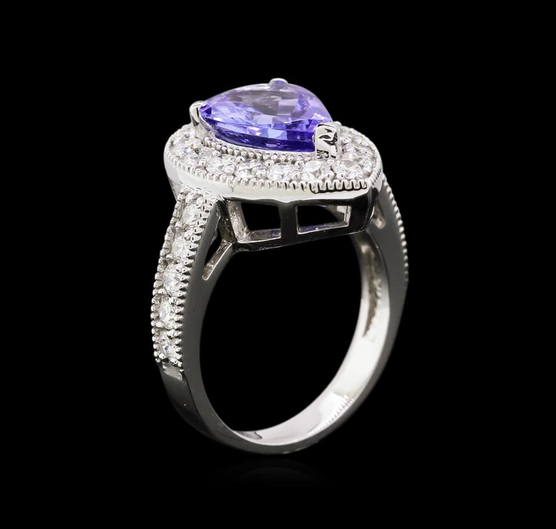 One electronically tested 14KT white gold ladies cast tanzanite & diamond ring with a bright and milgrain finish. The featured tanzanite is set within a diamond bezel, supported by diamond set shoulders, completed by a three millimeter wide band. Trademark is K14. Condition is new, good workmanship. Containing: One prong set pear brilliant cut natural tanzanite, measuring 12.00 x 9.00 x 4.40mm, approximate weight of 3.04ct., clarity is eye clean, type I, medium dark, slightly grayish, bluish violet color, (GIA bV 6/2), cut is good. Transmitting light with no distortion, transparent. Graded in the setting. Tanzanite is a very rare gemstone that is only found in the country of Tanzania. Originally discovered in 1967. Tiffany & Company, named the stone Tanzanite. It is found in the Usumburu Mountains that border the Umba Valley of northern Tanzania. Tanzanite occurs in gray, brown, violet, blue, reddish-purple, & green. The gem is interesting because of its exceptional pleochroism. Rotated in different directions a tanzanite will exhibit multiple changes of color. Tanzanite has a low tolerance to ultrasonic cleaning, and should not be cleaned using this method. Twenty-Seven prong set round brilliant cut diamonds, measuring 2.30 - 2.20 x 1.40mm (depth est.) approximate total weight of 27 Stones = 1.18ct. Graded in the setting. Clarity: SI-2 to I-1. Color: H - J. Total Weight of Colored Stones 3.04ct. Total Weight of Diamonds 1.18ct. Total Weight of Ring 6.70 grams. AIG Appraised at $10,400.00.