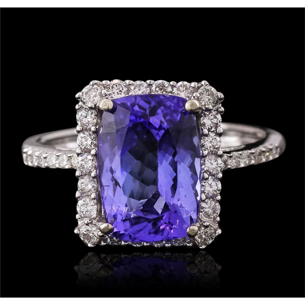 One electronically tested 14KT white gold ladies combination cast & assembled tanzanite and diamond ring with a flat shank with a bright polish finish. Identified with markings of "14K". Condition is new. Containing: One prong set rectangular cushion modified brilliant cut natural tanzanite, measuring 10.76 x 7.58 x 4.74mm, approximate weight of 3.04ct., clarity is eye clean, type I, medium, moderately strong, violet color, (GIA V 5/4), cut is good. Thirty-Six prong set round brilliant cut diamonds, measuring 1.50 - 1.00 x 0.75mm (depth est.) approximate total weight of 36 Stones = 0.26ct. Clarity: I-1 to I-2. Color: I - J, Cut is Good. Colored gemstones are presumed to have been subjected to commonly used enhancement processes. All diamonds and colored gemstones are graded in the mounting, unless otherwise stated. Total Weight of Colored Stones 3.04ct. Total Weight of Diamonds 0.26ct. Total Weight of Ring 3.10 grams. GGL Appraised at $5,850.00.