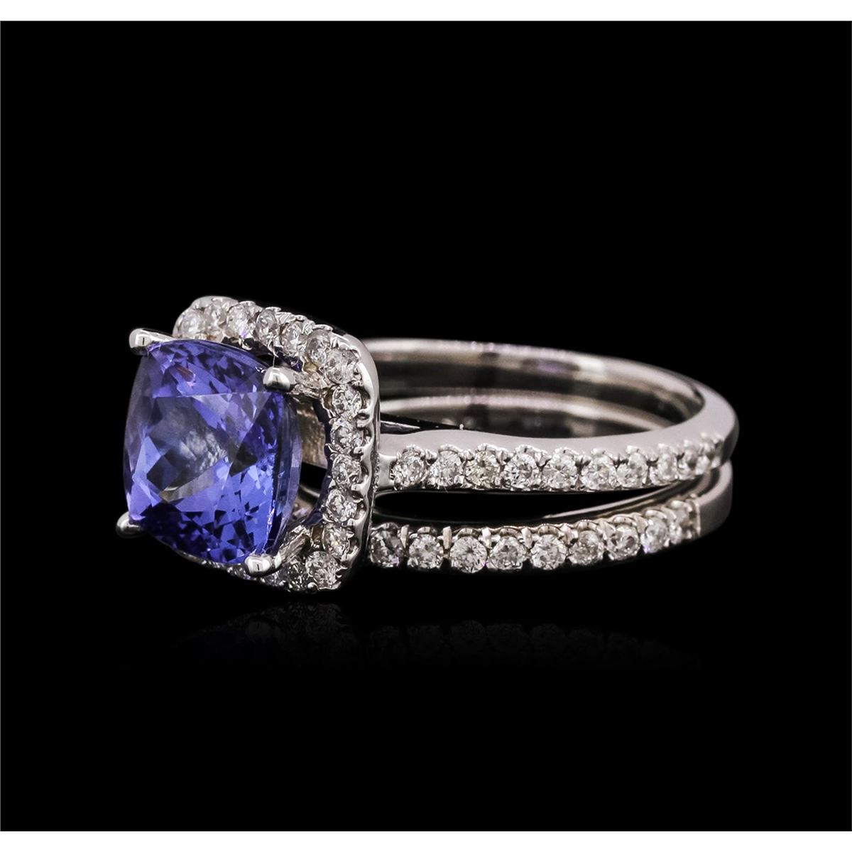 One electronically tested 14KT white gold ladies cast tanzanite and diamond ring & wedding band with a bright polish finish. Identified with markings of "14KT". Condition is new. Containing: One prong set square cushion modified brilliant cut natural tanzanite, measuring 8.40 x 8.40 x 5.47mm, approximate weight of 3.04ct., clarity is eye clean, type I, medium light, very slightly grayish, violet color, (GIA V 4/3), cut is very good. Sixty-Two prong set round brilliant cut diamonds, measuring 1.50 - 1.50 x 0.90mm (depth est.) approximate total weight of 62 Stones = 0.76ct. Clarity: SI-1 to I-1. Color: I - J, Cut is Good. Colored gemstones are presumed to have been subjected to commonly used enhancement processes. All diamonds and colored gemstones are graded in the mounting, unless otherwise stated. Total Weight of Colored Stones 3.04ct. Total Weight of Diamonds 0.76ct. Total Weight of Ring & Wedding Band 6.90 grams. GGL Appraised at $4,785.00.