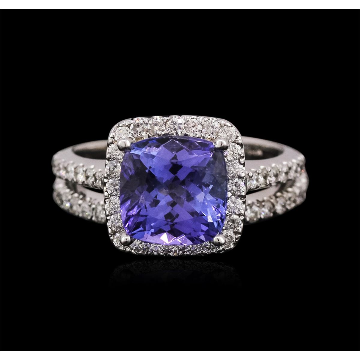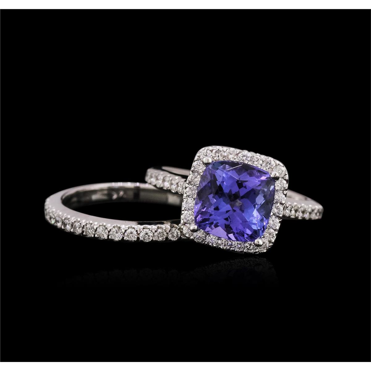 One electronically tested 14KT white gold ladies cast tanzanite and diamond ring & wedding band with a bright polish finish. Identified with markings of "14KT". Condition is new. Containing: One prong set square cushion modified brilliant cut natural tanzanite, measuring 8.40 x 8.40 x 5.47mm, approximate weight of 3.04ct., clarity is eye clean, type I, medium light, very slightly grayish, violet color, (GIA V 4/3), cut is very good. Sixty-Two prong set round brilliant cut diamonds, measuring 1.50 - 1.50 x 0.90mm (depth est.) approximate total weight of 62 Stones = 0.76ct. Clarity: SI-1 to I-1. Color: I - J, Cut is Good. Colored gemstones are presumed to have been subjected to commonly used enhancement processes. All diamonds and colored gemstones are graded in the mounting, unless otherwise stated. Total Weight of Colored Stones 3.04ct. Total Weight of Diamonds 0.76ct. Total Weight of Ring & Wedding Band 6.90 grams. GGL Appraised at $4,785.00.