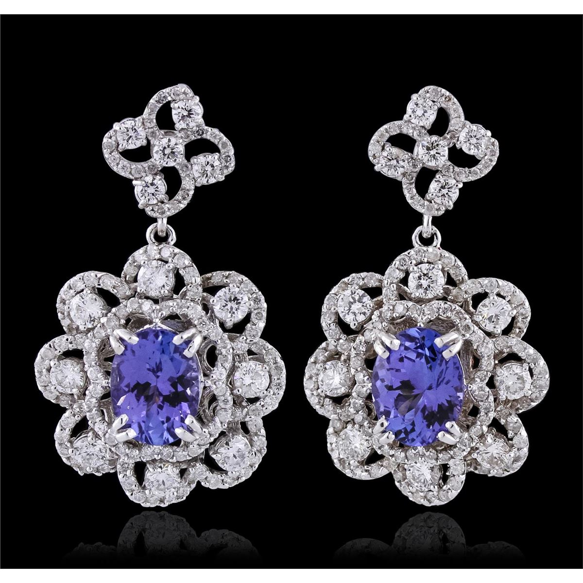 One pair electronically tested 14KT white gold ladies combination cast & assembled dangle earrings with hinged clip backs with a bright polish finish. Condition is new. Identified with markings of "K14". Containing: Two prong set oval modified brilliant cut natural tanzanites, measuring 8.80 x 6.20 x 4.03mm, approximate. Total Weight of 3.04ct., clarity is eye clean, type I, medium light, very slightly grayish, bluish violet color, (GIA bV 4/3), cut is good. Sixteen prong set round brilliant cut diamonds, measuring 2.50 - 2.50 x 1.50mm (depth est.) approximate. Total Weight of 16 Stones = 0.91ct. Clarity: SI-1 to SI-2. Color: I - J, Cut is Good. Ten prong set round brilliant cut diamonds, measuring 2.20 - 2.20 x 1.32mm (depth est.) approximate. Total Weight of 10 Stones = 0.39ct. Clarity: SI-1 to SI-2. Color: H - I, Cut is Good. Two Hundred Sixteen prong set round brilliant cut diamonds, measuring 1.00 - 1.00 x 0.60mm (depth est.) approximate. Total Weight of 216 Stones = 0.78ct. Clarity: I-1 to I-2. Color: I - J, Cut is Good. Colored gemstones are presumed to have been subjected to commonly used enhancement processes. All diamonds and colored gemstones are graded in the mounting, unless otherwise stated. Total Weight of Colored Stones 3.04ct. Total Weight of Diamonds 2.08ct. Total Weight of Earrings 9.80 grams. GGL Appraised at $12,710.00.
